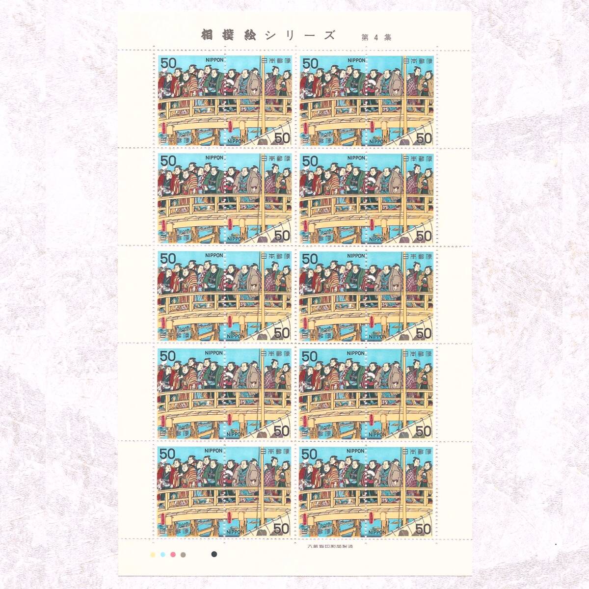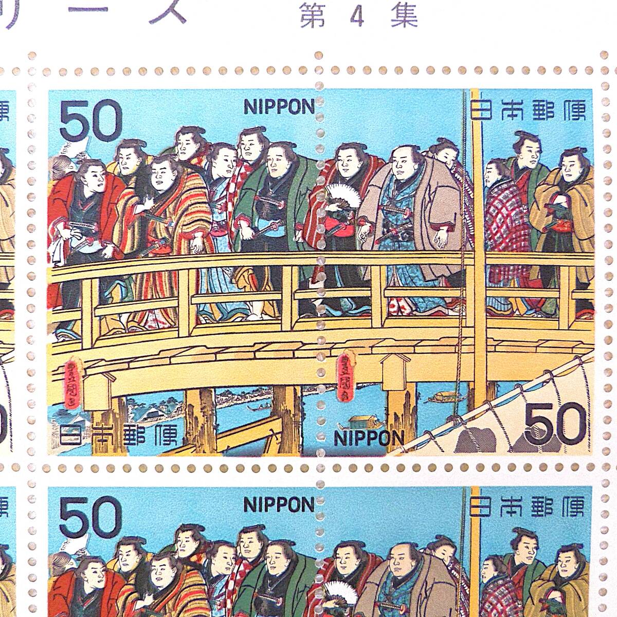「大角力両国橋渡の図」相撲絵シリーズ第4集◇1979年(昭和54年)発行◇2連刷20面x50円切手=額面1000円1シート未使用◇送料180円-