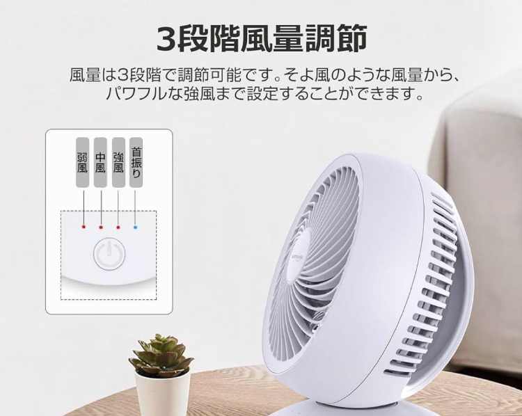 【風量3段階調整&嬉しい静音設計】スイッチ1つで風量は微風から強風まで3段階調整ができるので、丁度よい風を堪能でき、小さく場所を取らないので卓上 扇風機としても使用可能です。