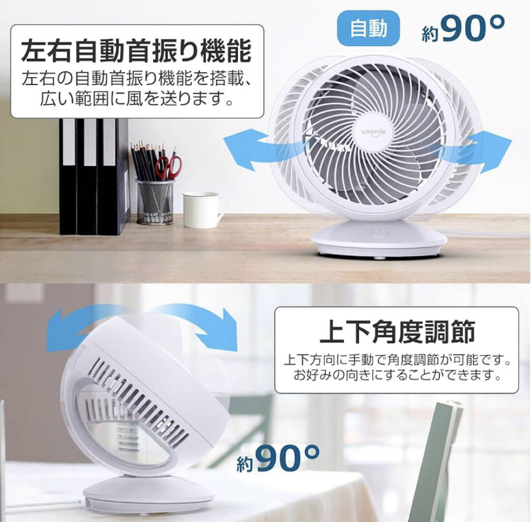 Umimile サーキュレーター 首振り 静音 壁掛け 扇風機 小型 卓上 dcモーター 6畳 羽根径17cm 風量3段階調節 省エネ 5枚羽根 USB電源