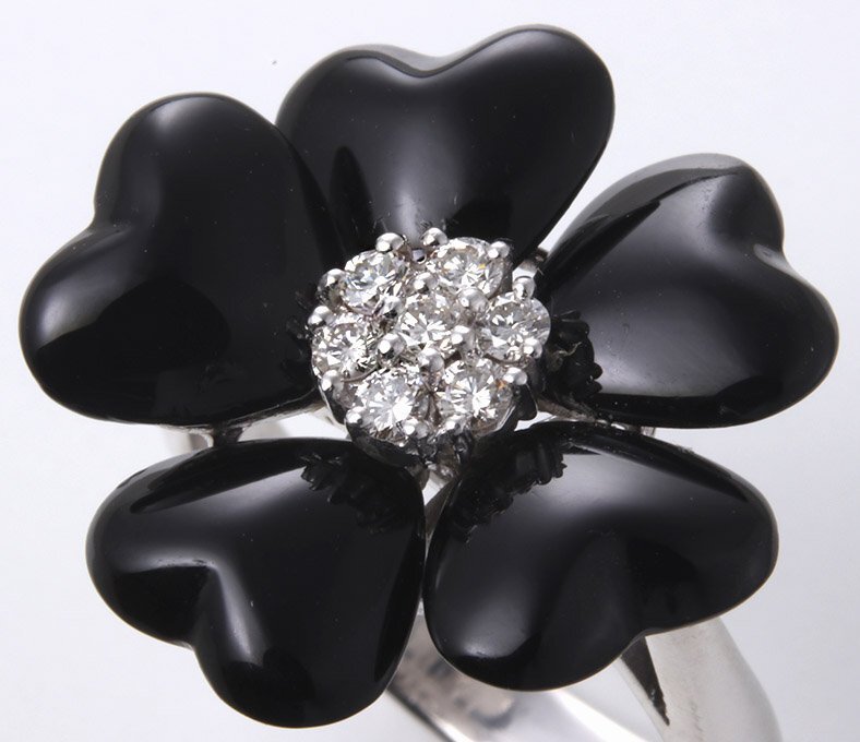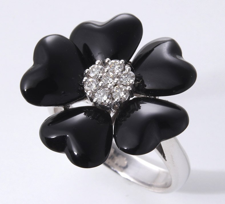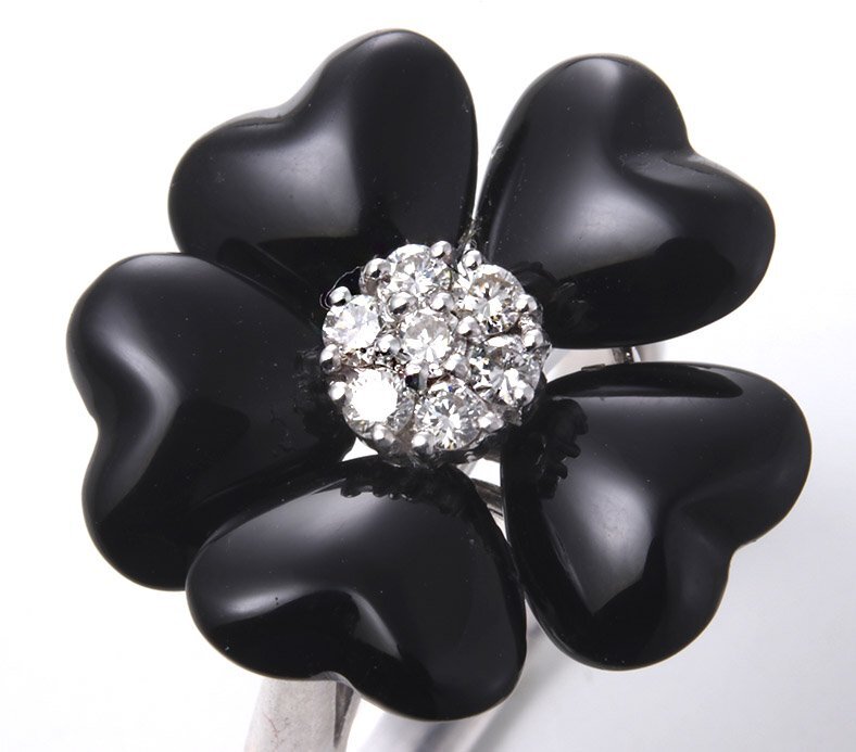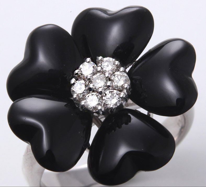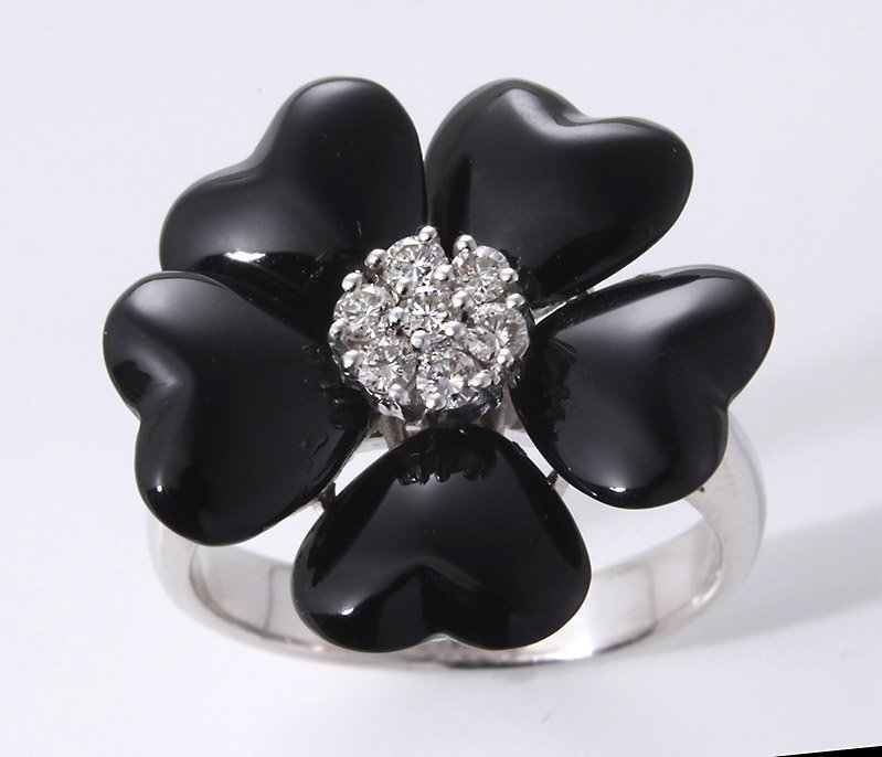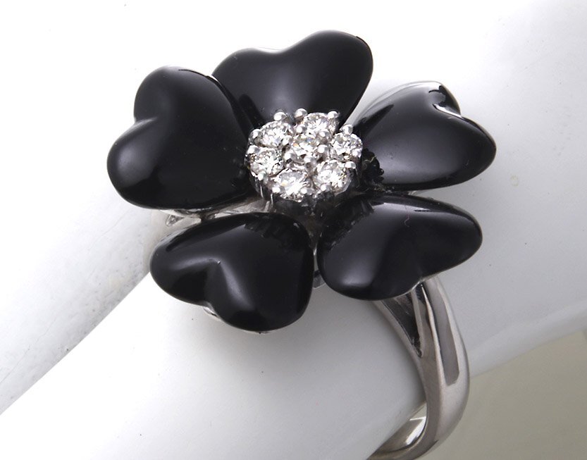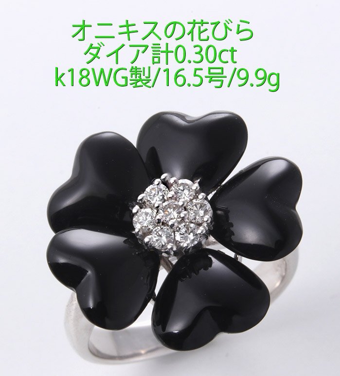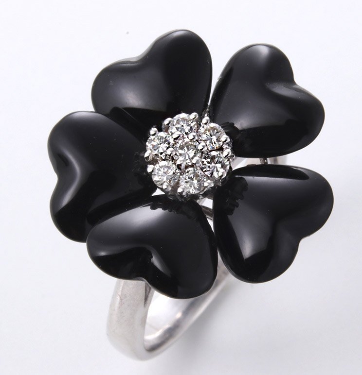 | コメント | [[全ての商品に品質保証カードが付きますのでご安心ください]]不要な悪縁を遠ざけ、意志や精神力を強化すると言われているオニキスです。5枚のハート型カットでシックな花が造られています。センターのダイアは合計で0.30カラットです。 |