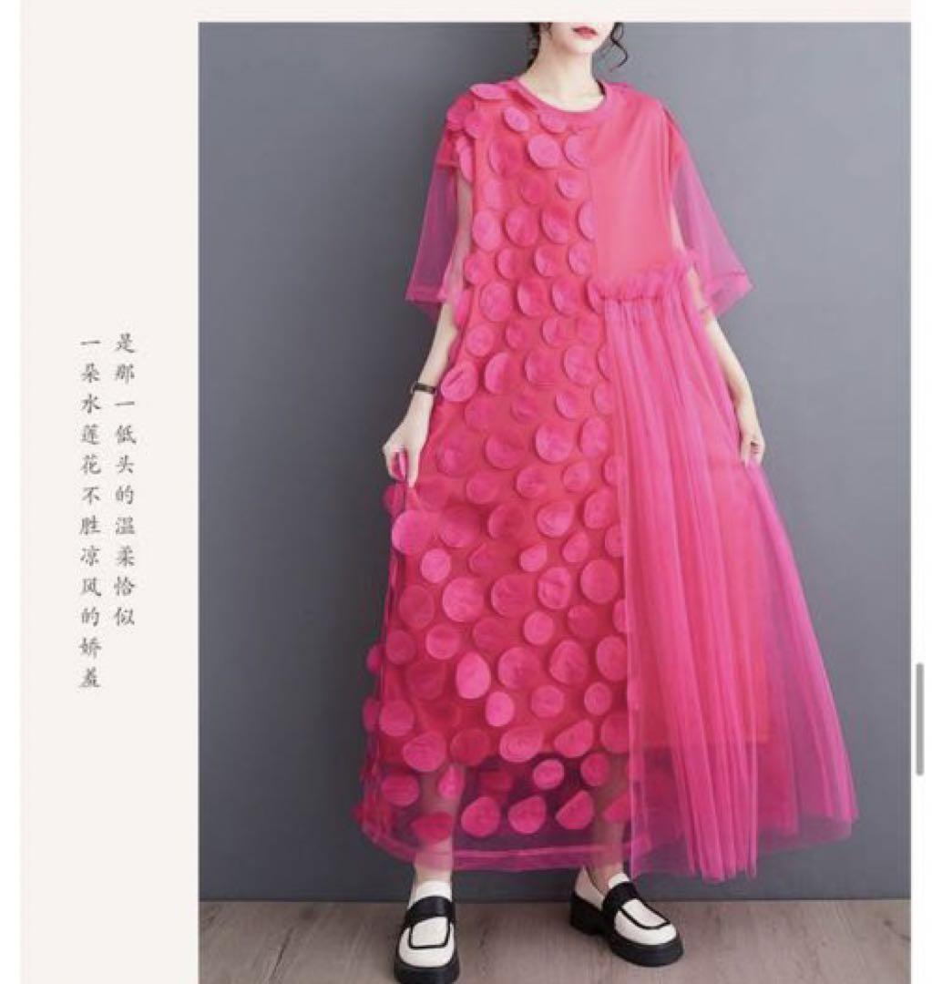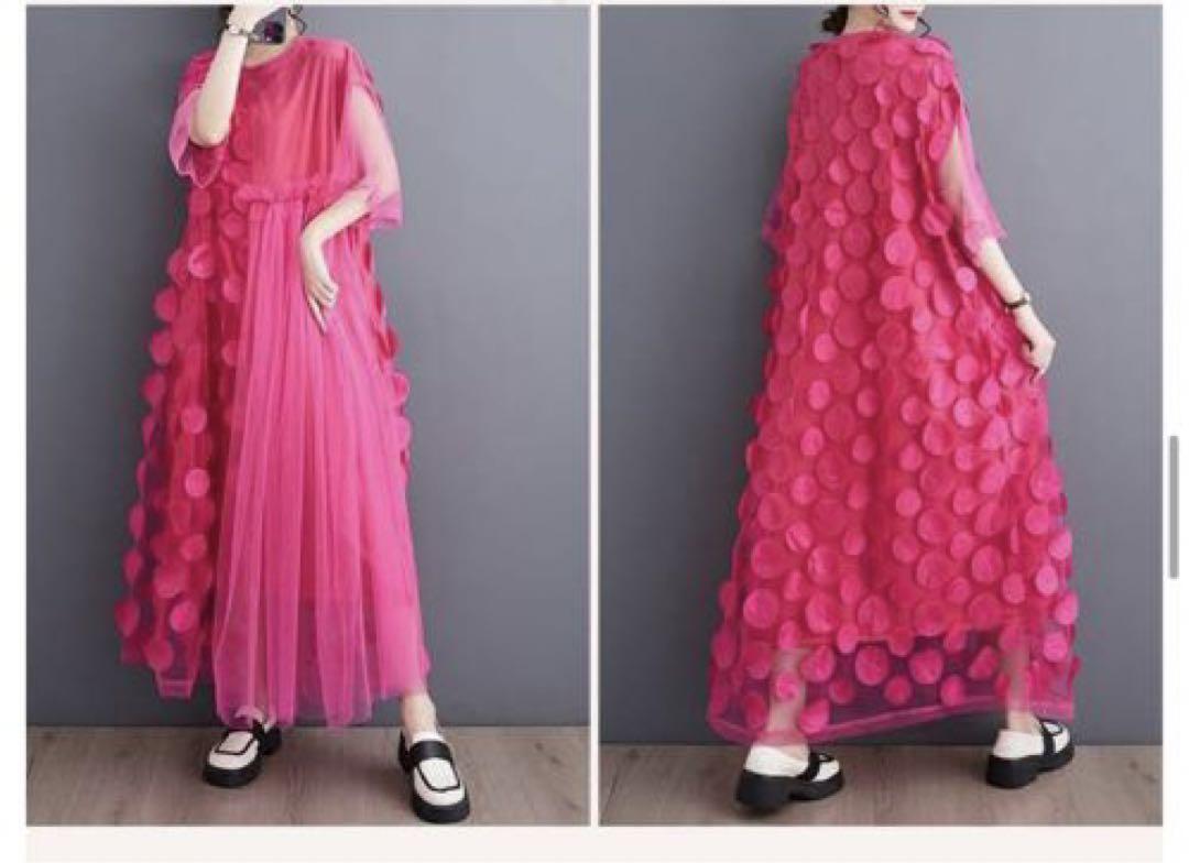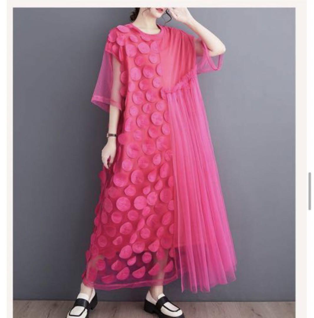 ワンピース レース ドット 大きいサイズ レディース 春夏 新品 半袖 ピンク ロング