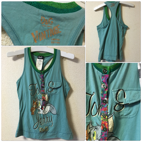以上の2点セットです。 ヴィンテージのタンクは花柄などの異素材がデザインされた主役級のお洒落なトップスでワンランク上のお洒落さんにオススメ。ボトムにガウチョやデニムタイトスカートを合わせると素敵です。