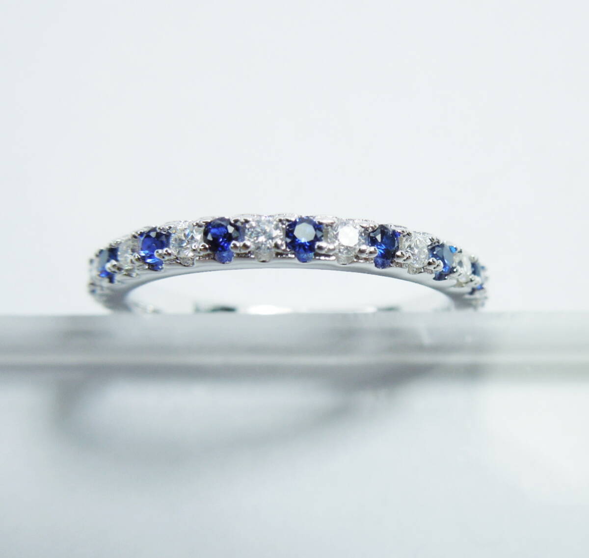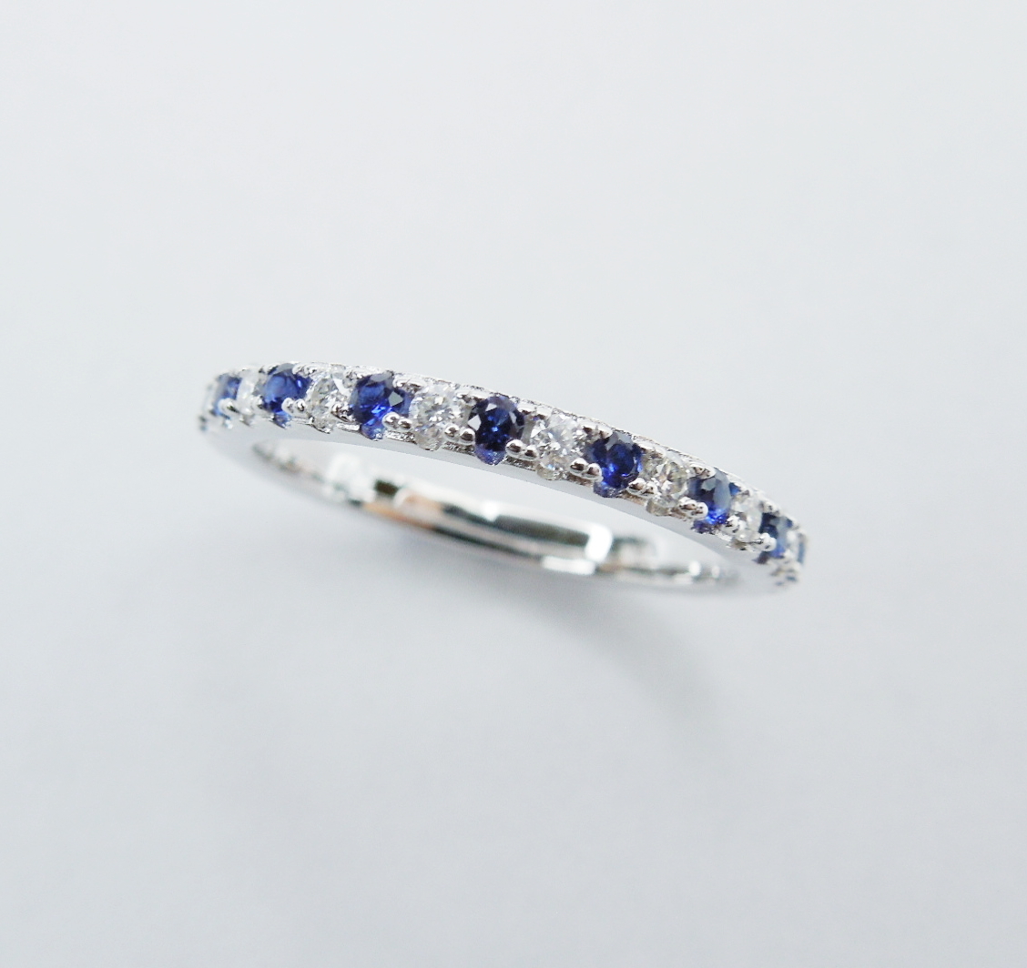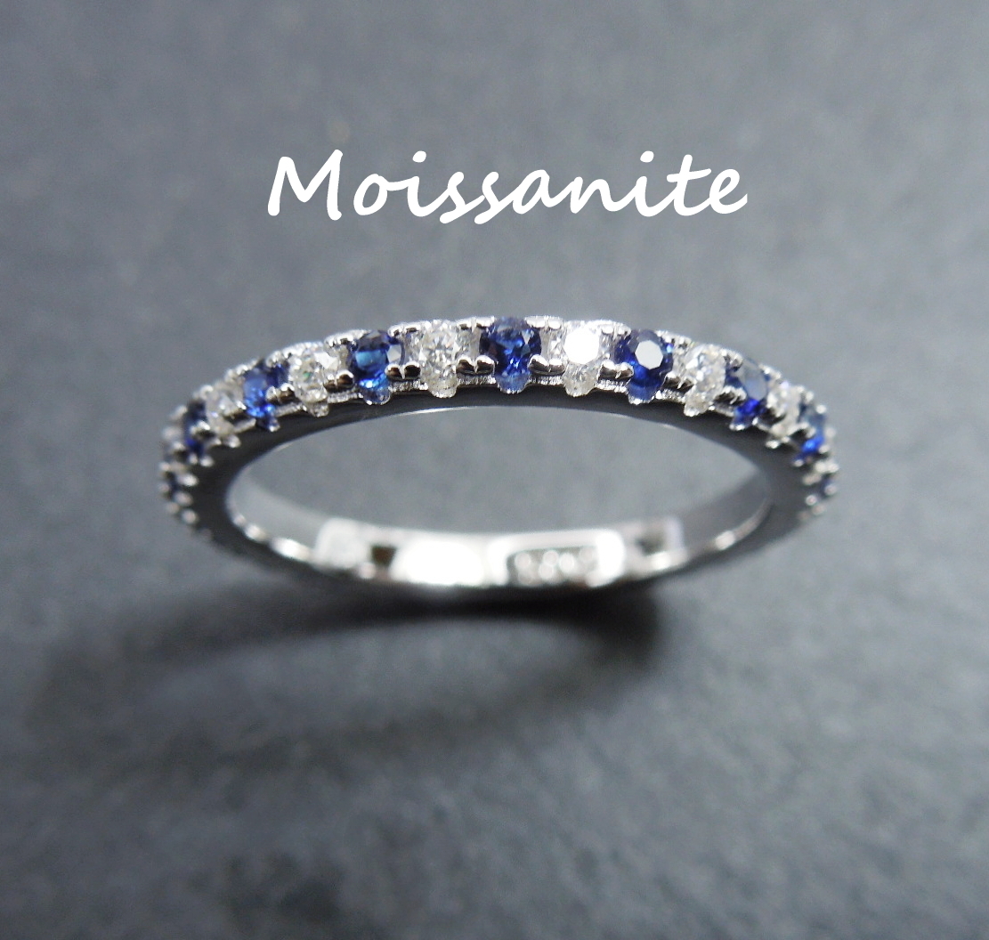 リング一周全てにモアサナイトとブルーサファイアが交互にセッティングされております。