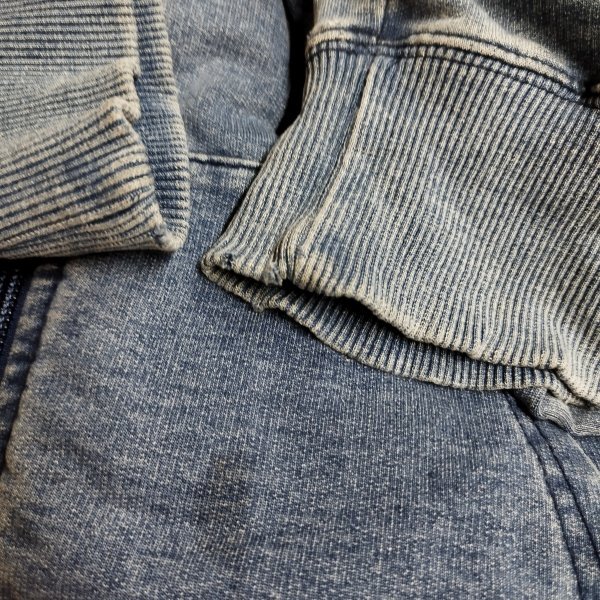 【状態】C(全体的に色褪せ、前ポケット汚れ、袖裾リブにダメージや穴有り※画像参照)