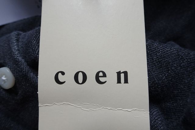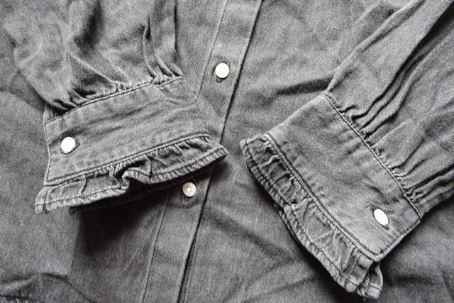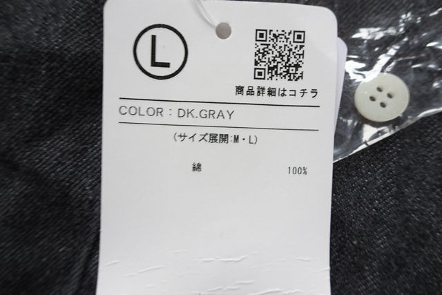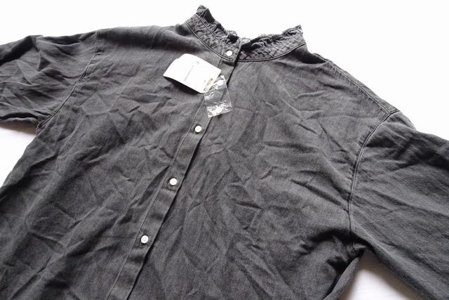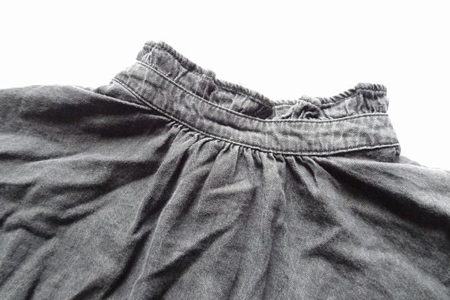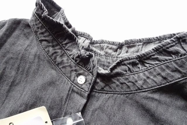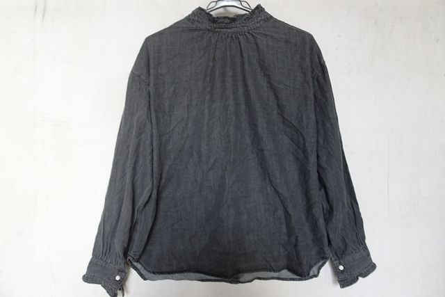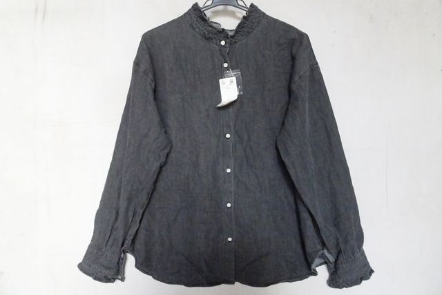 coen/コーエン/長袖シャツ/ブラウス/デニム風素材/バンドカラー/首ぐり・袖口フリル/グレー/Lサイズ/タグ付(6/18R7)
