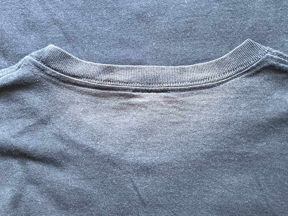 ブラックTシャツ特有の褪色(特に首周り)があります。