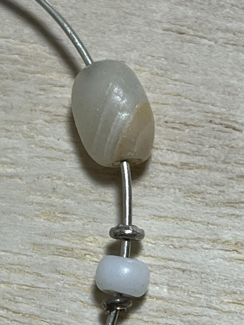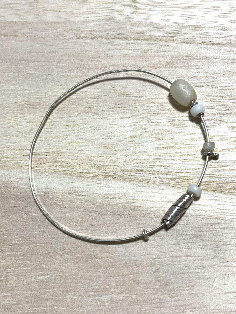 シルバーカラーのワイヤーに、異素材のビーズをアクセントとして配置し、個性的なデザインに仕上げました。