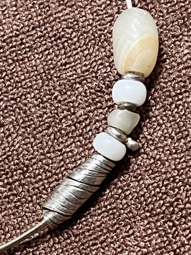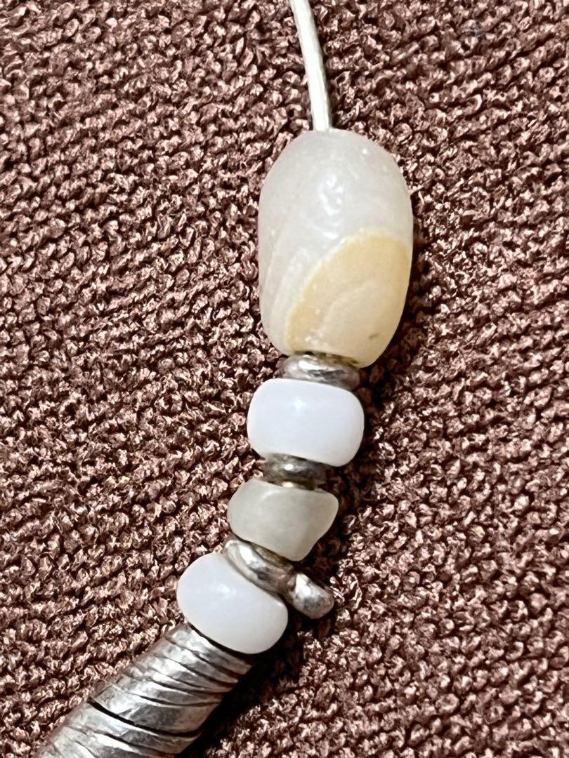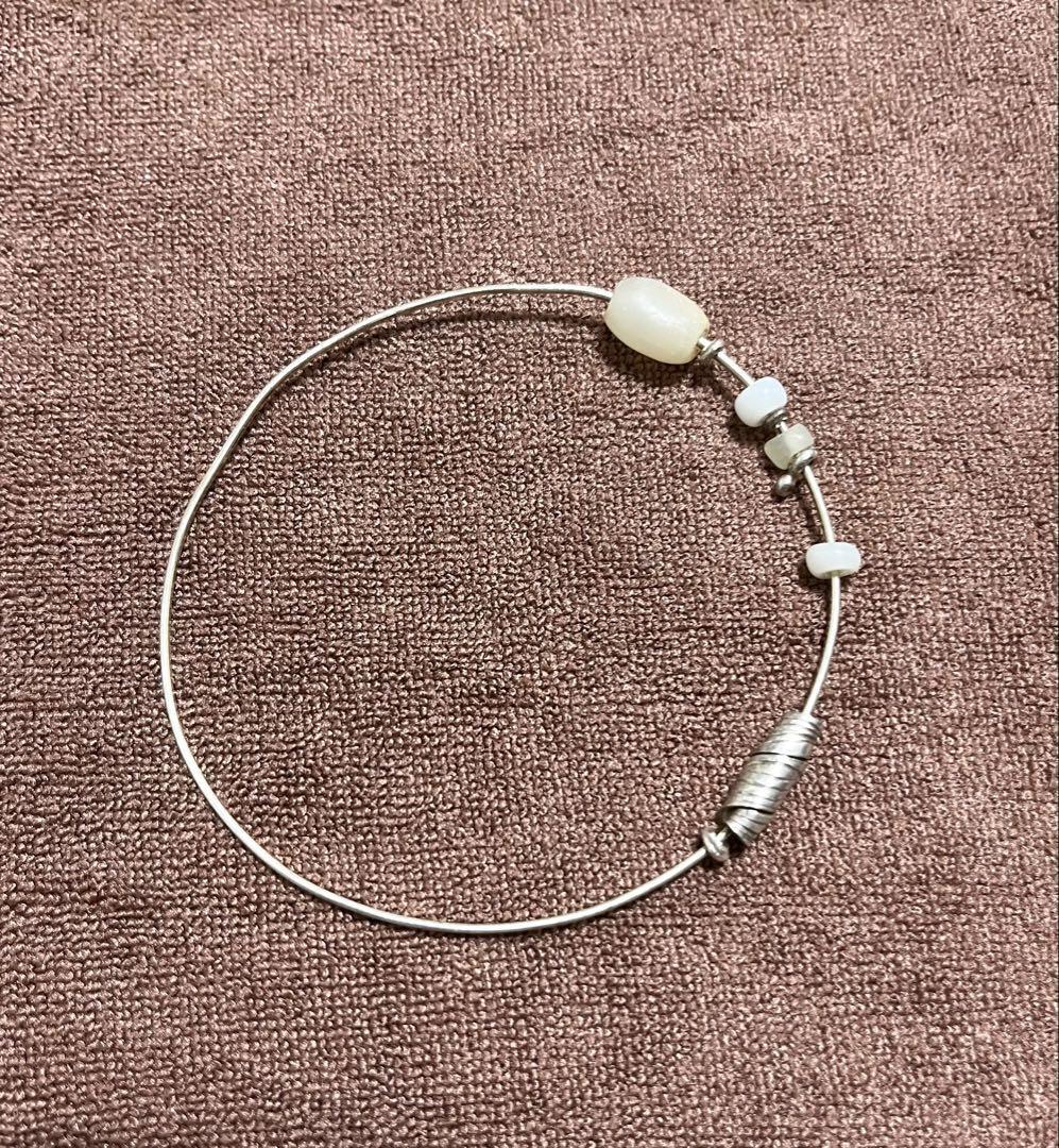 こちらは、ナチュラル風ビーズとメタルパーツを組み合わせたシンプルなハンドメイドブレスレットです。素材不明。