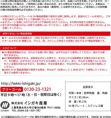「イシガキ 鍋 ブラック 約幅32.5×奥行28×高さ14.5cm 吹きこぼれにくい 土鍋 モダン 9号 容量 約 2.9L 4~5人用 IH ガ」▼4971360343044▼(商品説明)IH&直火・モダン 9号 4304・サイズ:約幅32.5cm×奥行28cm×高さ14.5cm(9号)・容量:約2.9L(4~5人用)・素材:(本体)耐熱陶器/(蓋)陶器/(IH用プレート)ステンレス鋼・ブラック・IH、ガス火対応可能説明 ●IH調理器とガス火でも使える吹きこぼれにくい土鍋。 ●土鍋ならではの「遠赤外線」効果で食材本来の持つ旨味を引き出します。 ●保温性も高いので温かさが持続しますので、熱々を長く楽しめます。 ●容量約2.9L。4~5人用。 ●付属のステンレスプレートはIH調理器で使用する際に使用します。表面にビニールを剥がし、フチが折曲がった面を下にして鍋内側にセットしてください。 ●オールメタル対応機種、1985年以前のマグネット式、業務用高出力機種には使用出来ません。 ●ご使用上の注意。 ●鍋の外側、特に底部の水気をよく拭き取ってから火にかけてください。 ●空焚きはしないでください。空焚きすると割れる事がありますので必ず鍋に水を入れてから火にかけてください。 ●IH調理器及びガス火でお使い頂く場合、火力は中火以下でご使用ください。強火ではご使用出来ません。 ●初めてご使用になる前に、鍋に水8分目と小麦粉を大さじ2杯ほど入れ、煮立ててください。よく煮え上がるようになり、汚れの染みこみも減らします。 ●鍋のフチまで水を満たした状態で使用しないでください。 ●熱した本体に冷水をかける等急激な温度変化を与えないでください。割れの原因となります。 ●調理中、調理後は、高温になっておりますので、火傷等しないように充分ご注意ください。 ●鍋をテーブル等に置く際は、鍋敷き等を敷いてから置いてください。 ●調理物は鍋に入れたまま保存せずに他の容器に移してください。 ●ステンレスプレートが虹色に変色する場合がありますが、体に有害なものではありません。 ●土鍋の内面が虹色に変色する場合があります。この現象は酸化被膜によるものです。異物の染み出し、品質の低下ではございません。 ●ご使用後のお手入れ方法 ●浸け置き洗いはおやめください。素焼き部分から内部に水がしみ込んでひび割れや破損の原因に、プレートはサビや腐食の原因となります。 ●使用後は本体・プレートが冷めてからスポンジに食器用洗剤をつけてよく洗い、十分すすいでください。 ●クレンザー・アルカリ性洗剤・金属たわしは使用しないでください。 ●食器洗浄乾燥機の御使用は出来ません。 ●焦げ付きがある場合は、鋭利な物を使用せず、ぬるま湯に浸して柔らかくしてから木べら等で取り除いてください。 ●洗浄後は鍋底を上にして通気性の良い場所で十分に乾燥してから保管してください。乾燥が不十分な場合、ひび割れやカビの原因になります。 ●洗浄後のステンレスプレートは、十分乾燥させてください。塩分・水分の付着はサビの原因になります。