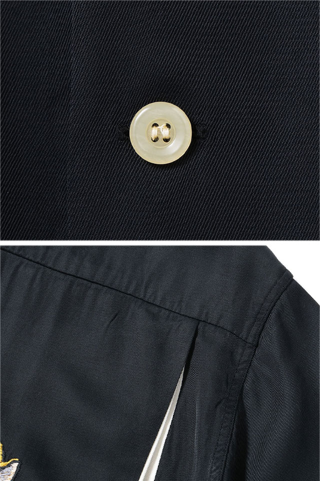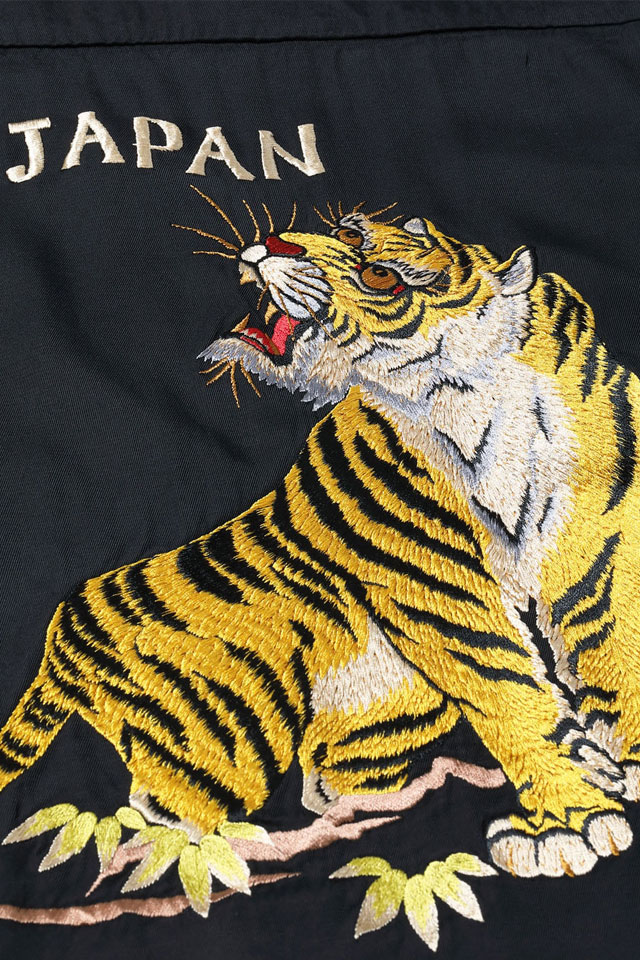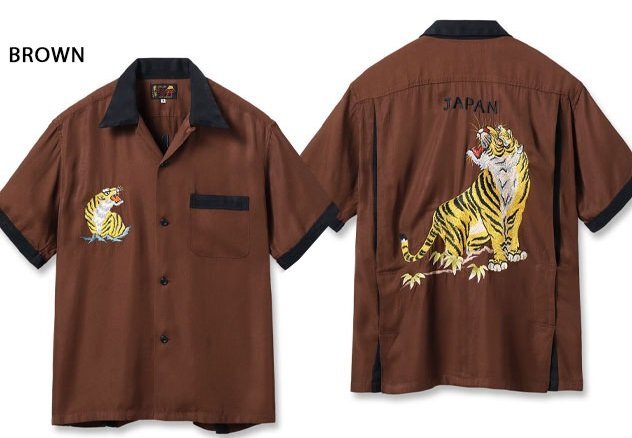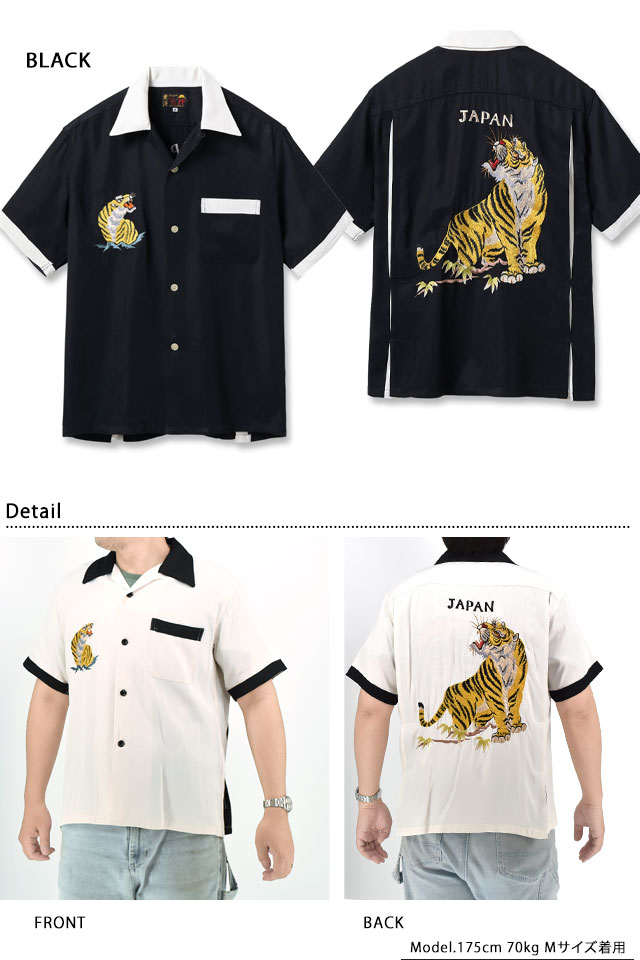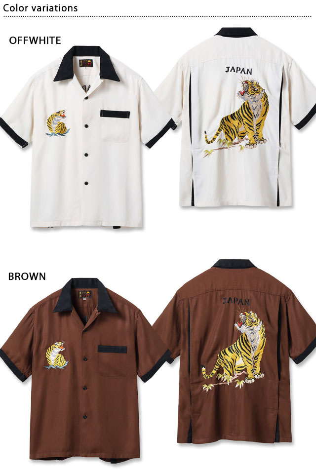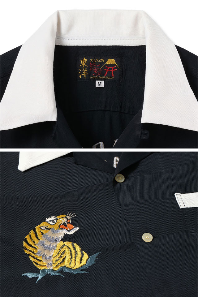 探求心と情熱を持って、上質なアイテムを製作し続けている「テーラー東洋」から、スカシャツ「ROARING TIGER」(TT39508)のご紹介です。 1950年代にスカジャンに描かれた図案をボウリングシャツ型へ落とし込んだ一着。 襟や袖口、アクションプリーツの色を身頃と切り替えることで、デザインのアクセントとしているのも特徴です。 軽やかなレーヨン素材のため、夏場でも気軽にスカジャンの雰囲気を味わえる一着に仕上がりました。 | |||||||||||||||||||||||||
