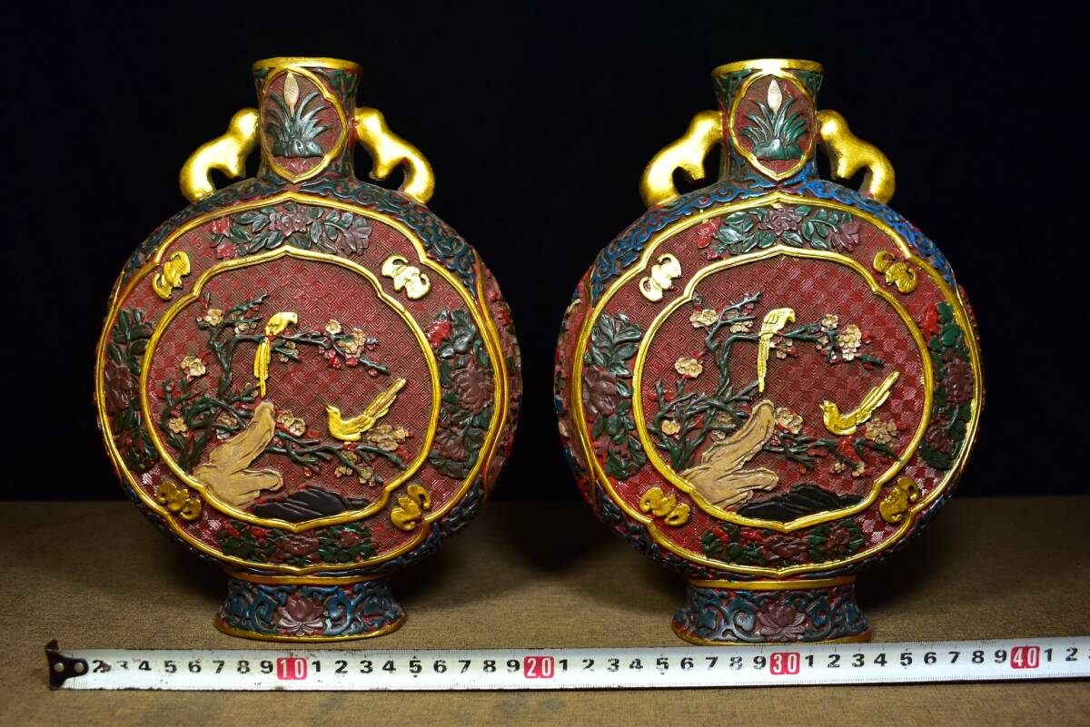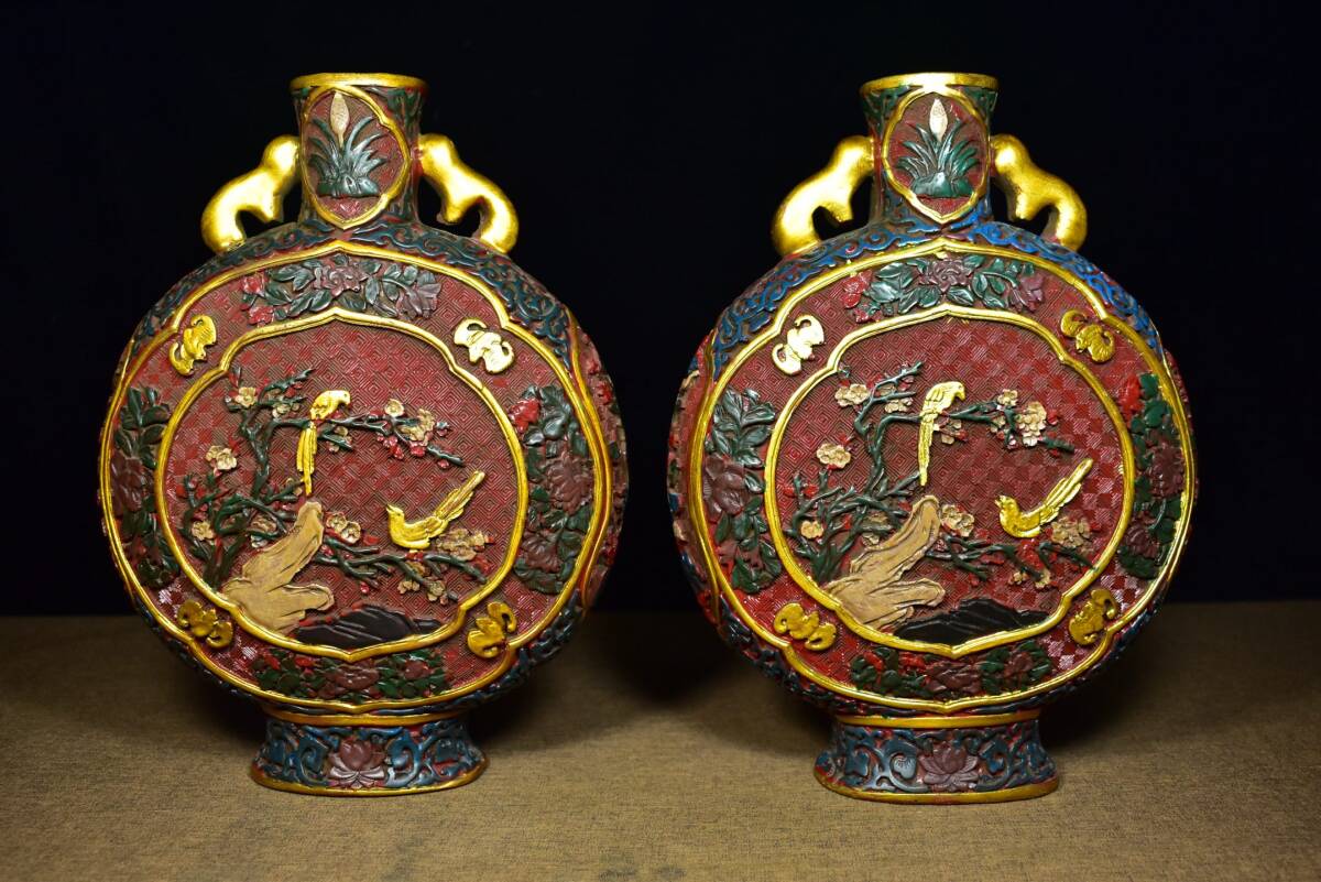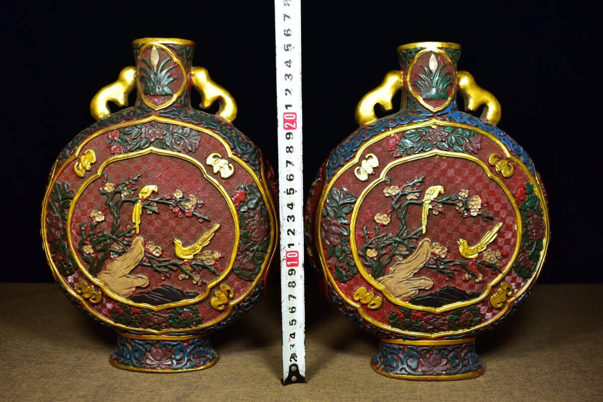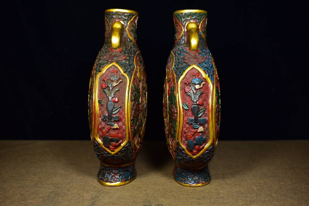 人間国宝 木製 【透き通った漆塗りの花瓶一対です】中国古美術 木彫 工芸品 彫刻品 珍材木彫 珍品旧蔵 伝世家珍 | |||