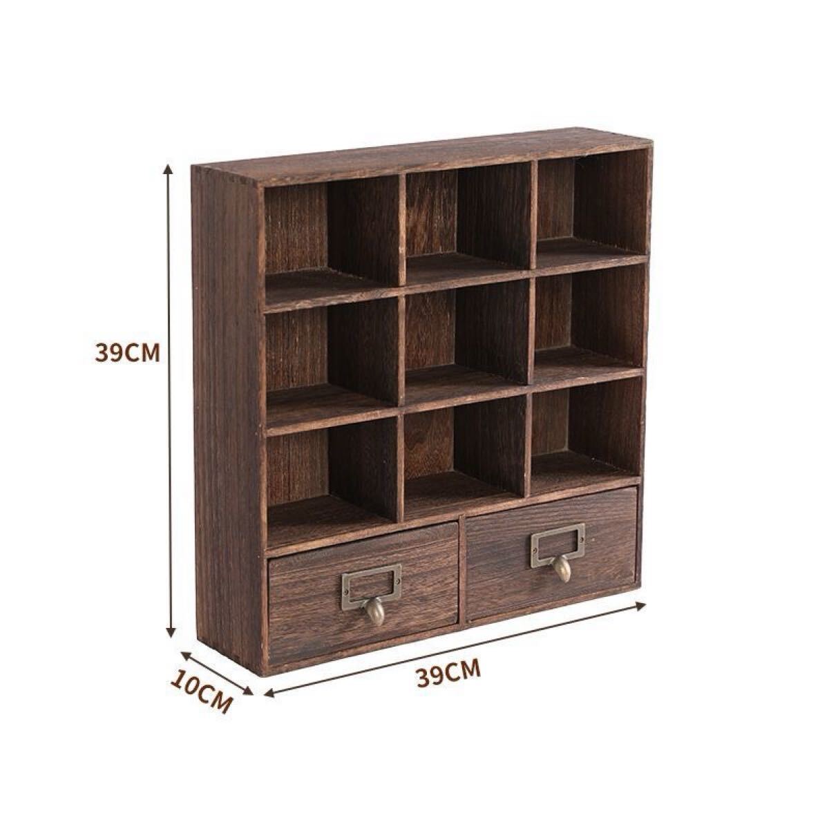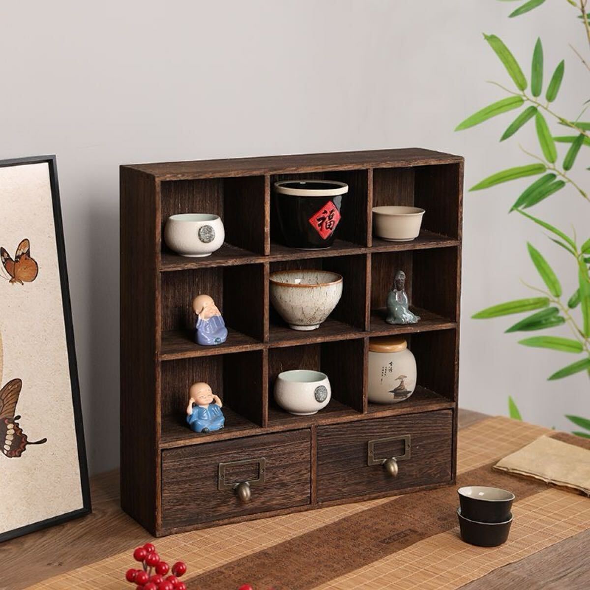 引き出し 木製ラック 茶器収納棚 茶キャビネット ティートレー 壁掛け可能 ウォール 9カット ディスプレイラック アクセサリー アンティーク珍品棚 調味料ラック マルチラック 棚花台 盆栽台 珍品展示 卓上整理 小物置き