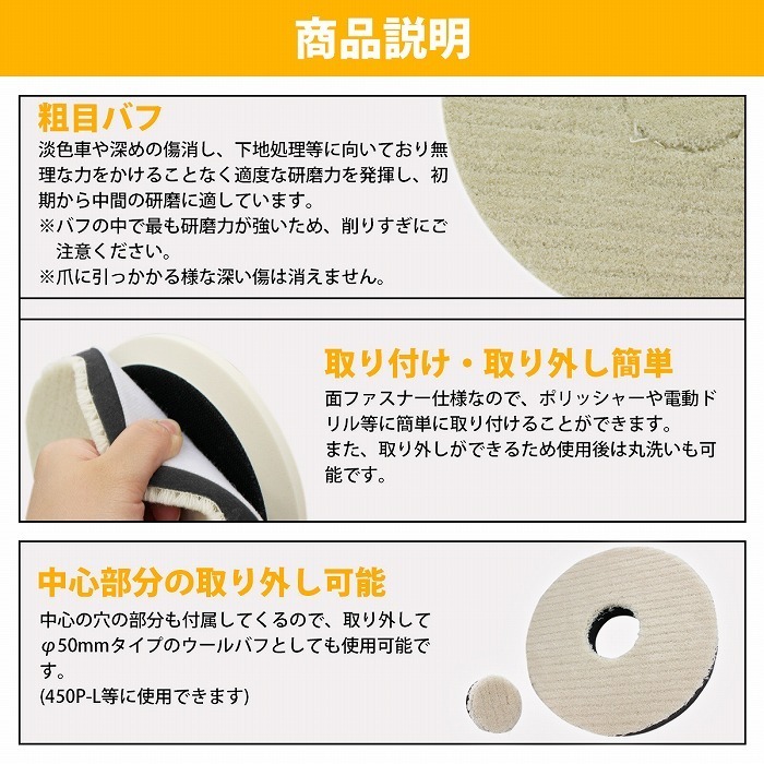 中心の穴の部分も付属してくるので、取り外してφ50mmタイプのウールバフとしても使用可能です。