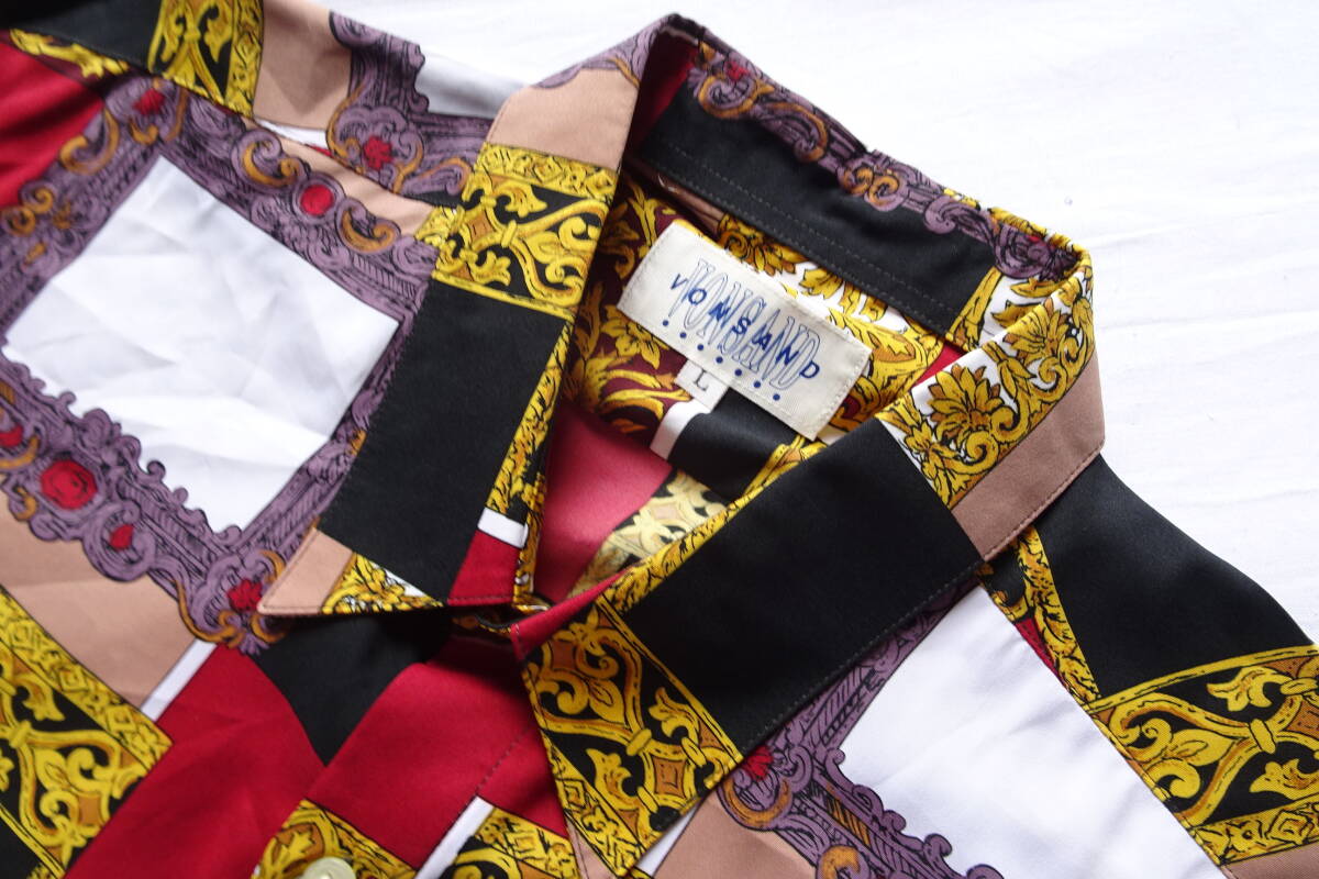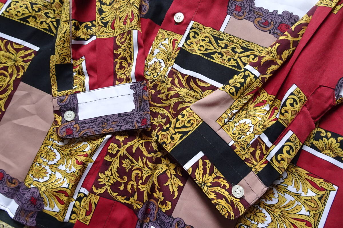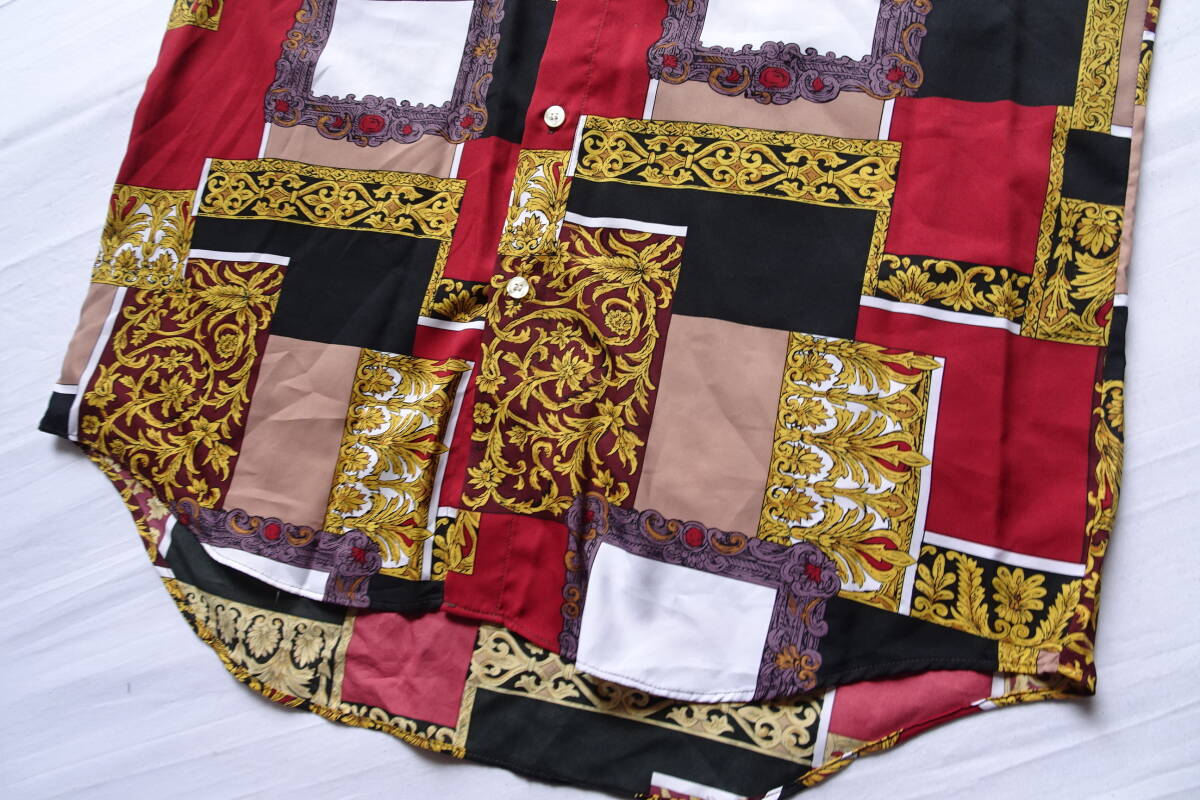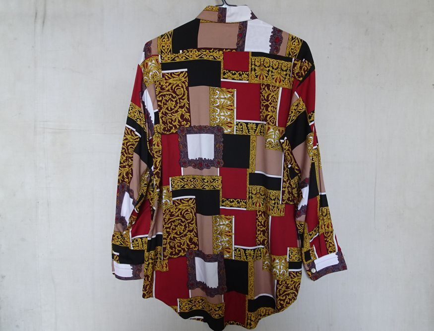 VONSAND/長袖シャツ/薄手素材/スカーフっぽい柄/額物/四角形/派手柄/赤/レッド/黒/ブラック/白/ホワイト/Lサイズ(6/17R7)