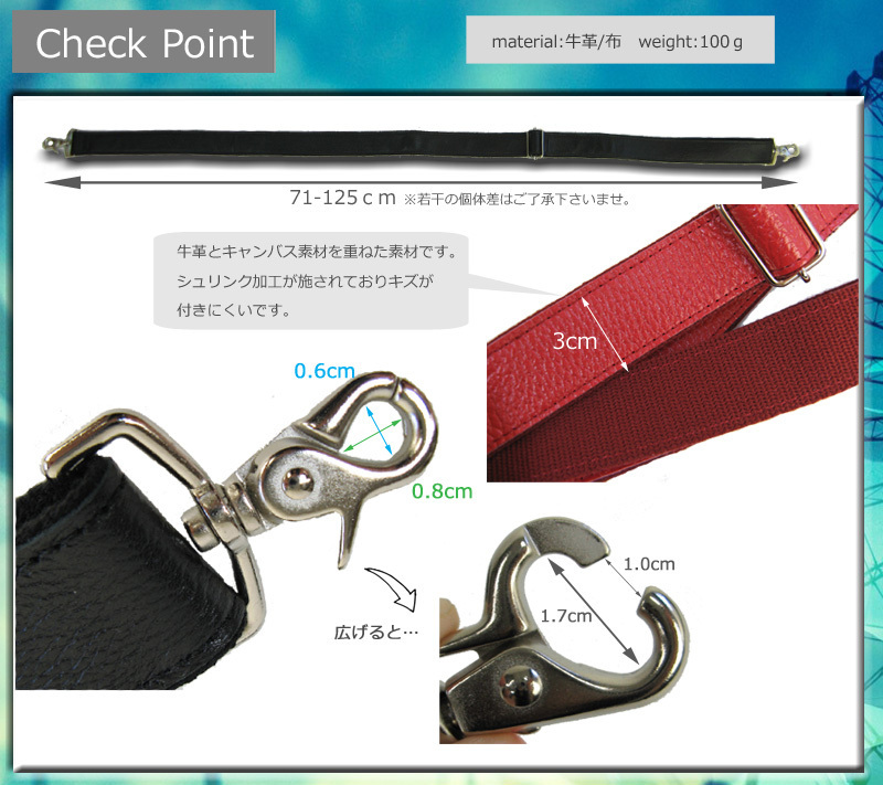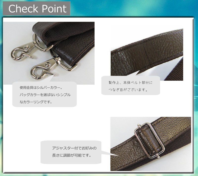 <Item information> ショルダーストラップ メーカー参考価格(税込) 3,080円 本革(牛革)のショルダーストラップです。表レザーはシュリンク加工が施されたキズ付きにくく、目立ちにくい質感なので気兼ねなく使えます。裏張りは全面にキャンバス素材を使用。丈夫な日本製の丁寧な作りです。幅は30mmで一般的な太めショルダーとして、少し大きめのバッグにも合わせやすい幅です。長さはお好みで調節可能(71~125cm)。金具はレバー式のナスカンを使用しており、着脱の際に開く幅が広めなので、太めのリング等への取り付けもOK。ワンタッチで取り付け可能で、幅広くお使いいただけます。金具はシンプルなシルバーカラー。カジュアルになりすぎない上品なデザインです。お手持ちのバッグの付け替えやハンドメイドのパーツとしてもおすすめです。 注)こちらはで800g前後のバッグに取り付ける事を想定して作られております。 極端に負荷をかけますと破損の原因となりますので、ご注意ください。 condition :新品 brand :- material :牛革 (裏張りファブリック) size :長さ71-125cm(金具含む) 重さ:100g weight :100g color :ダークブラウン 裏地 :あり 生産国:日本 |