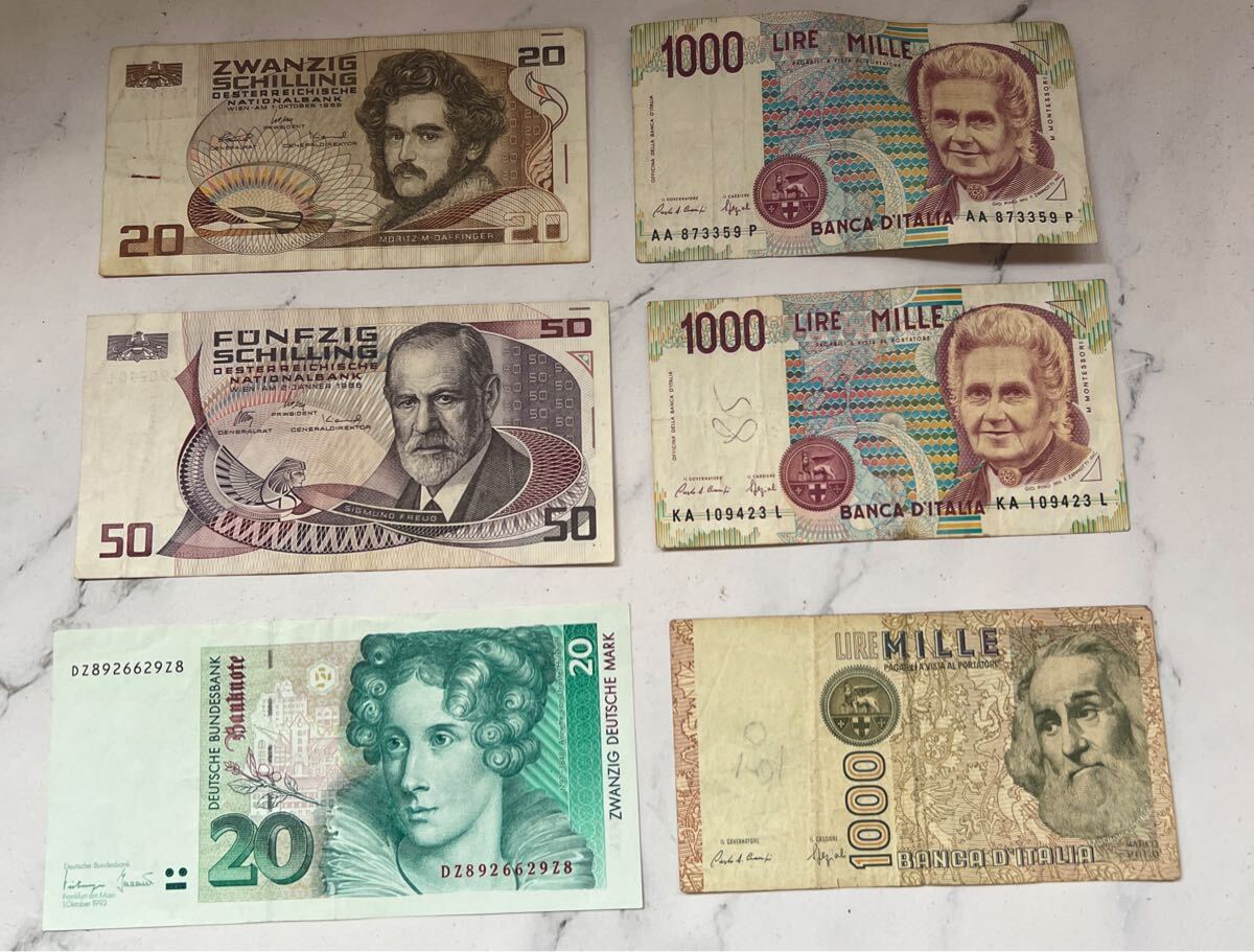 old banknotes Austria Germany Italy paper money vintage currency collection rare bills historical notes Schilling Deutsche Mark Lire obsolete money European banknotes foreign currency lot collectible numismatics