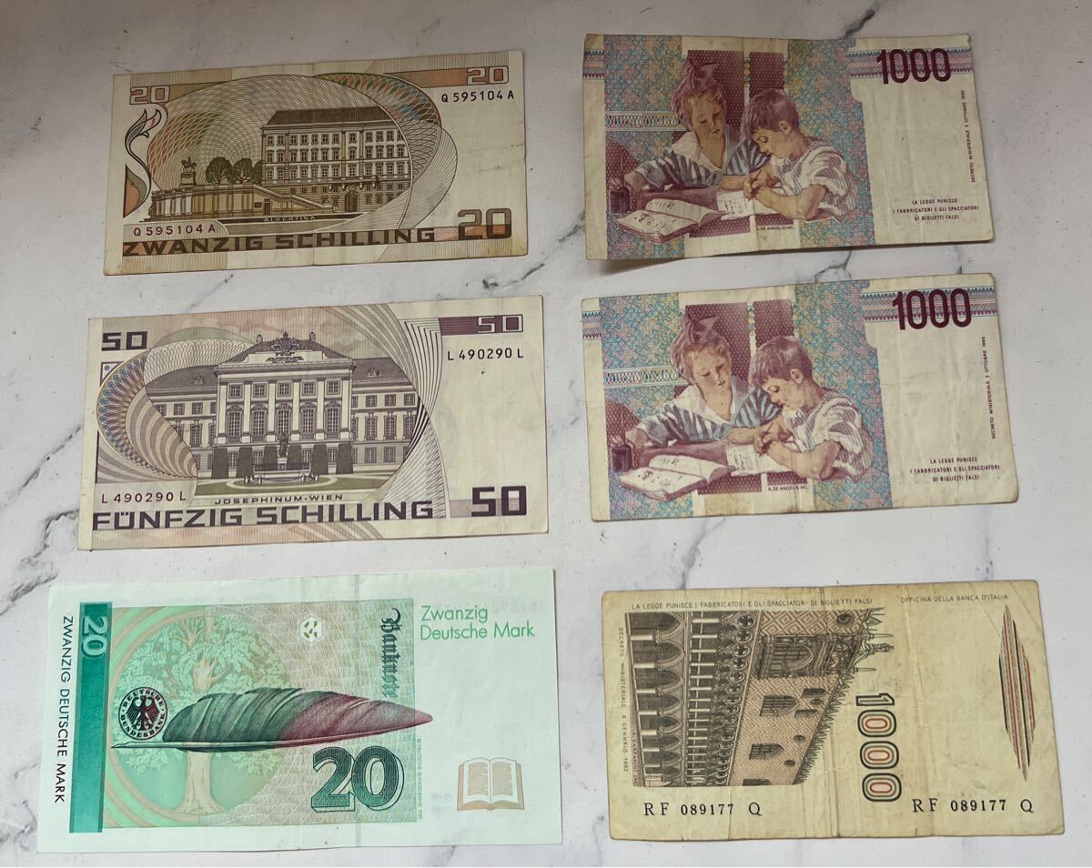 オーストリア シリング紙幣、ドイツマルク紙幣、イタリアリラ紙幣など、いずれも現在は流通していない希少な紙幣です。