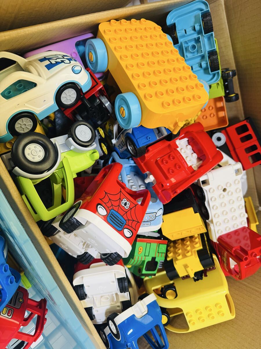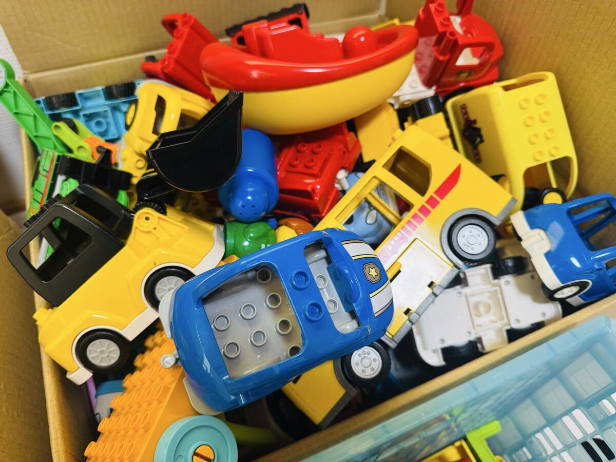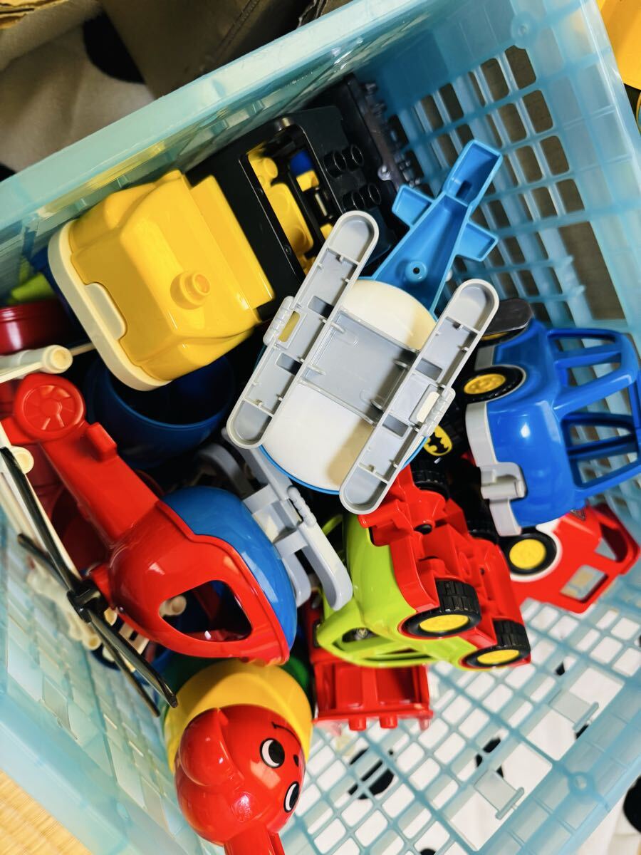 バスや車、重機やヘリコプター、ブロックやトンネルなどが約16kgございます。男の子向けのものが多いかと思います。
