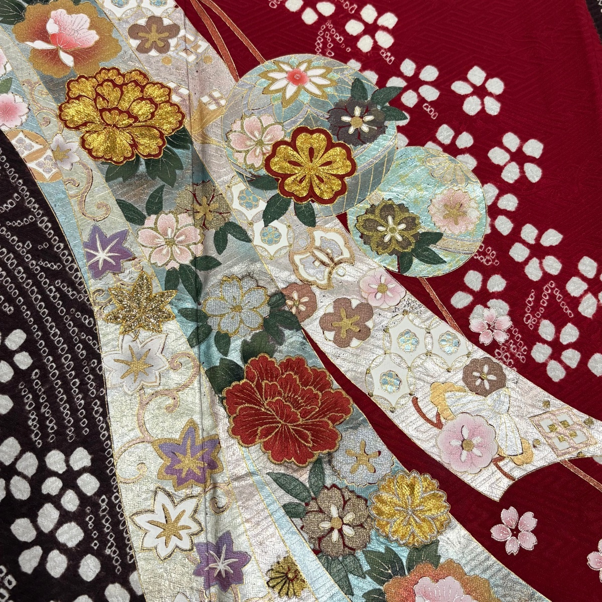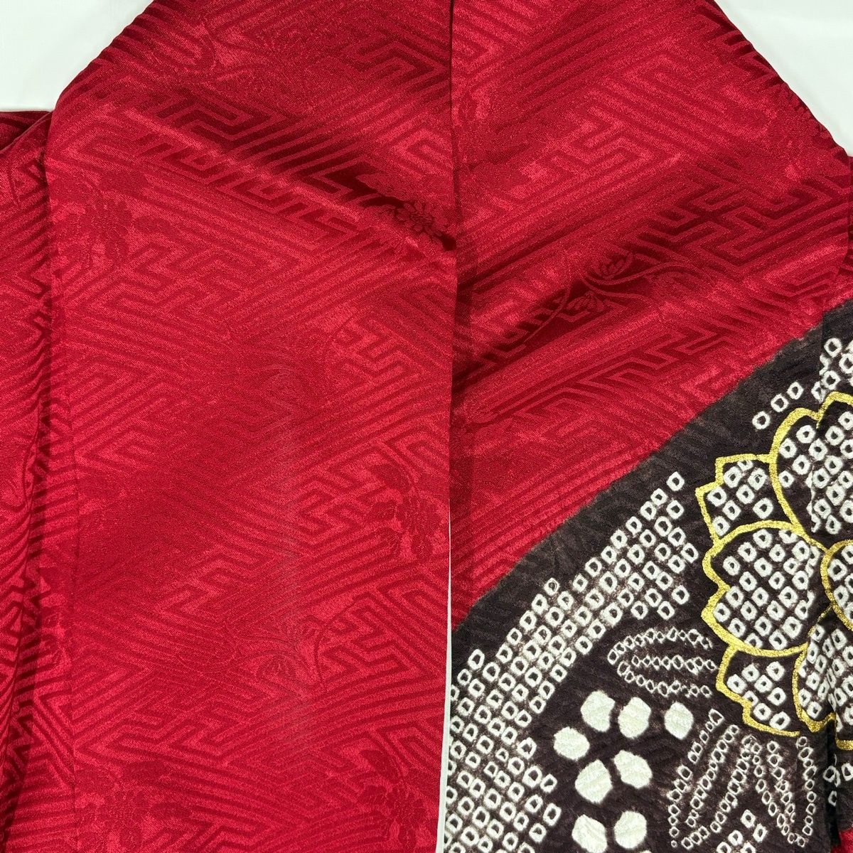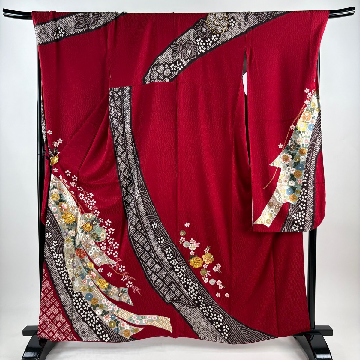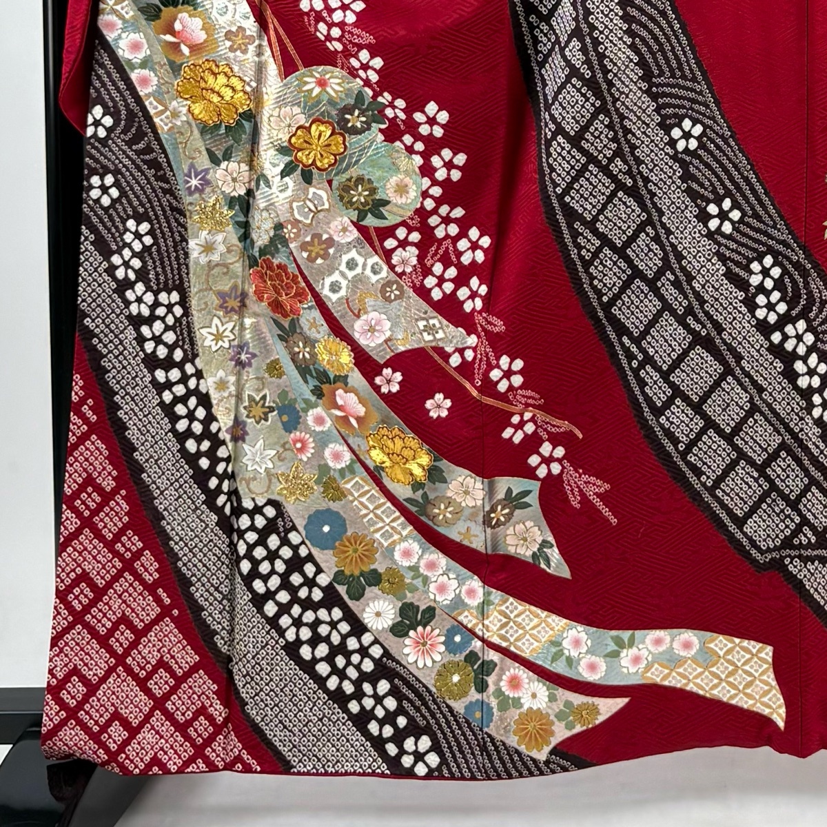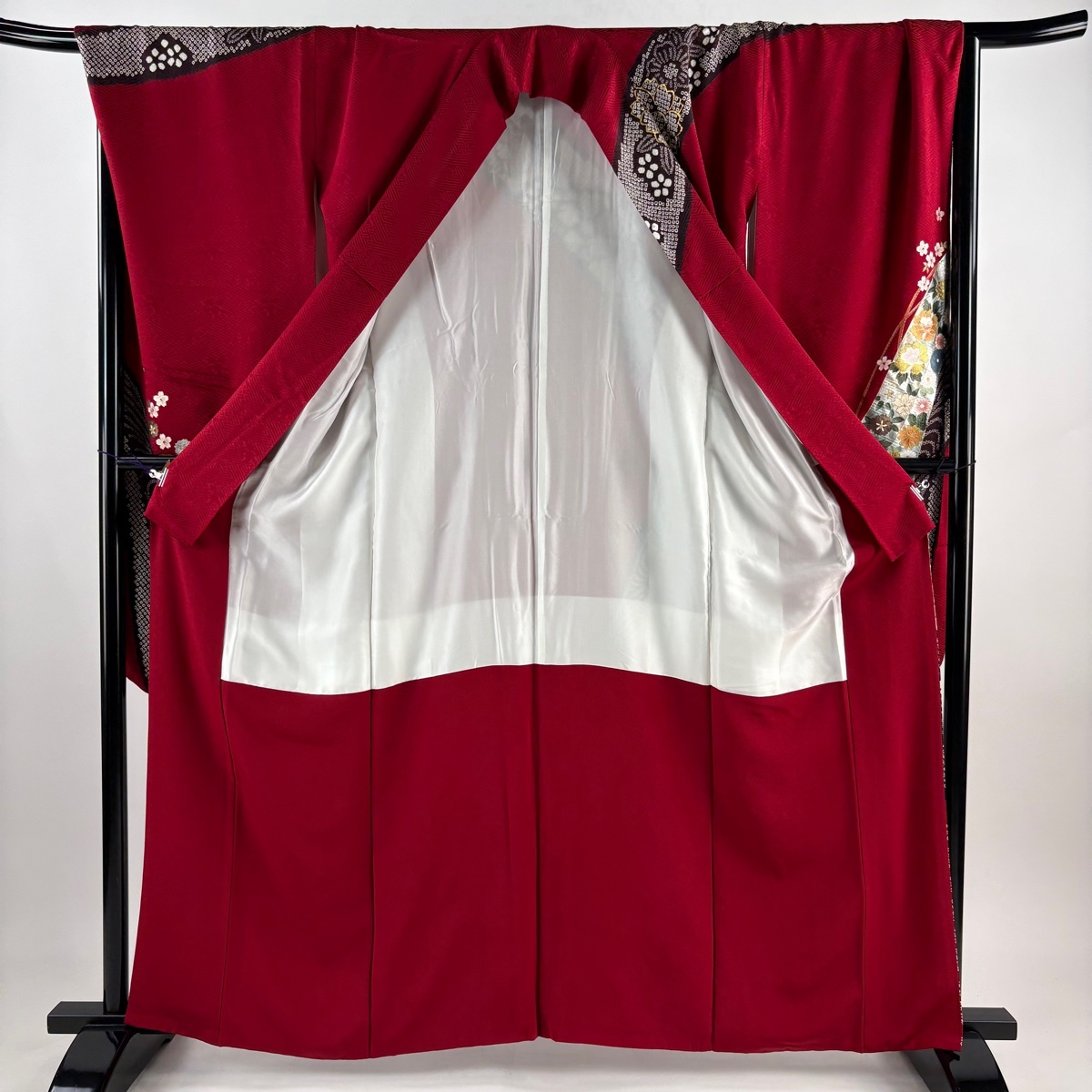 振袖 秀品 熨斗 鞠 金糸 絞り 赤 袷 身丈160 裄丈71 L 正絹 【中古】 |