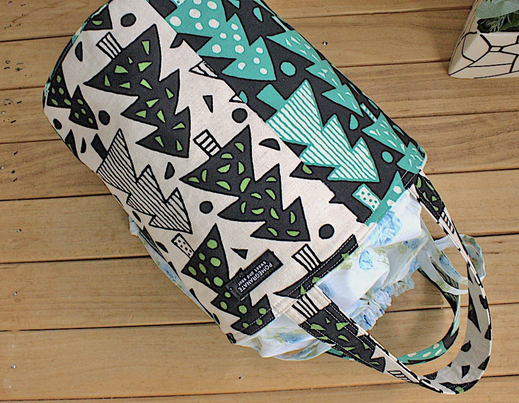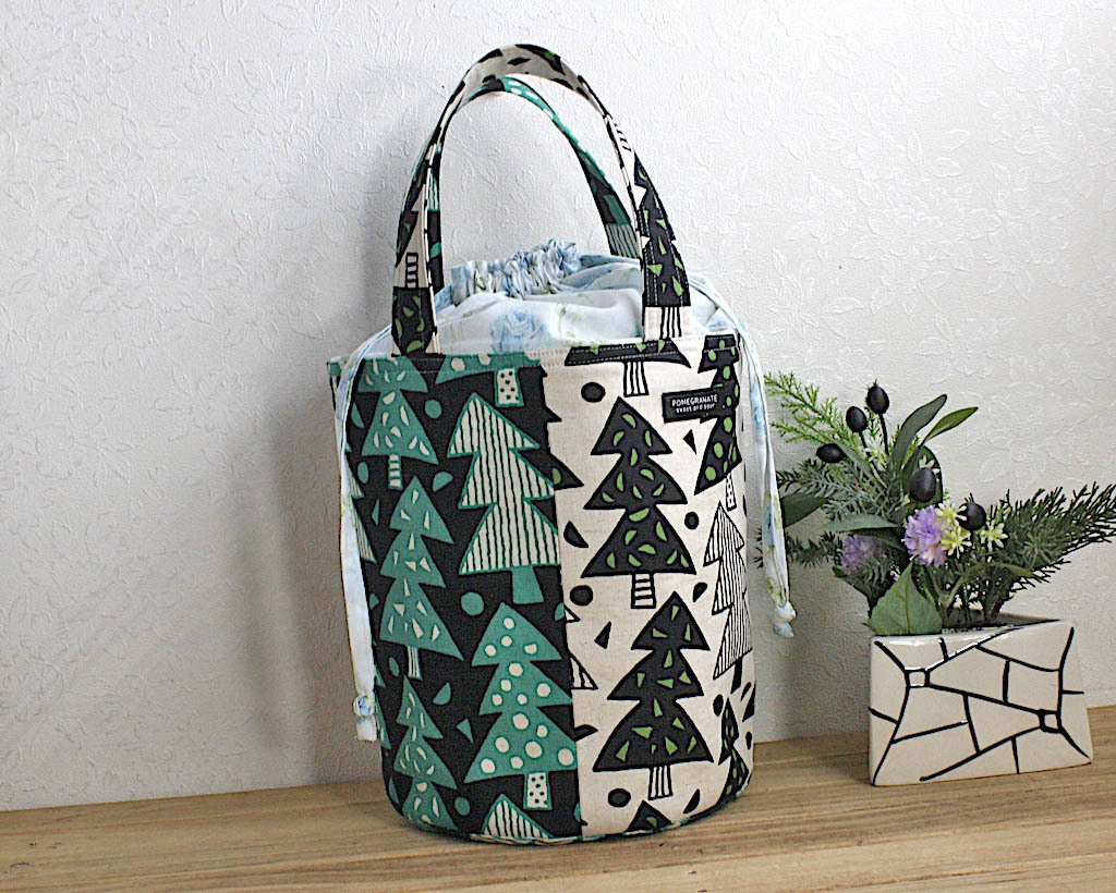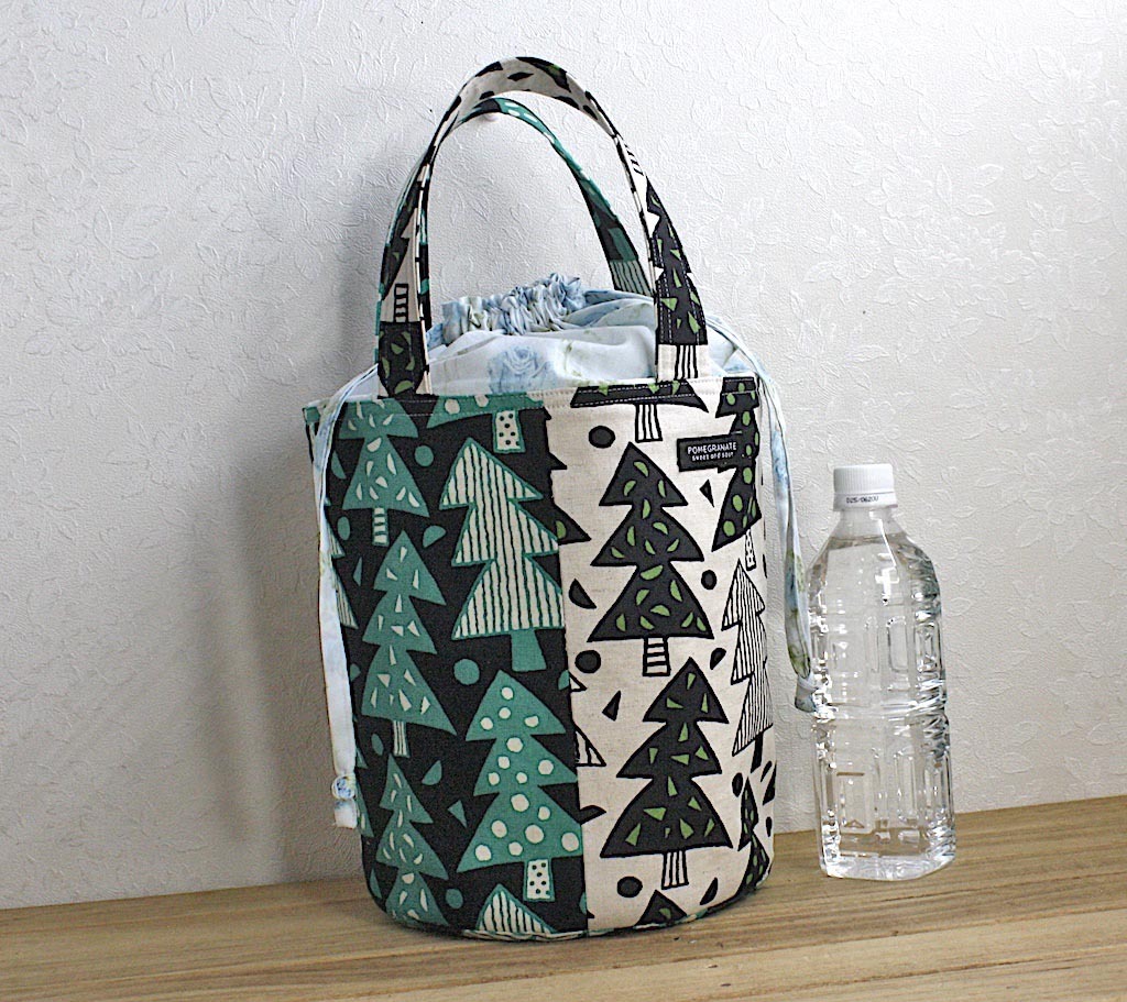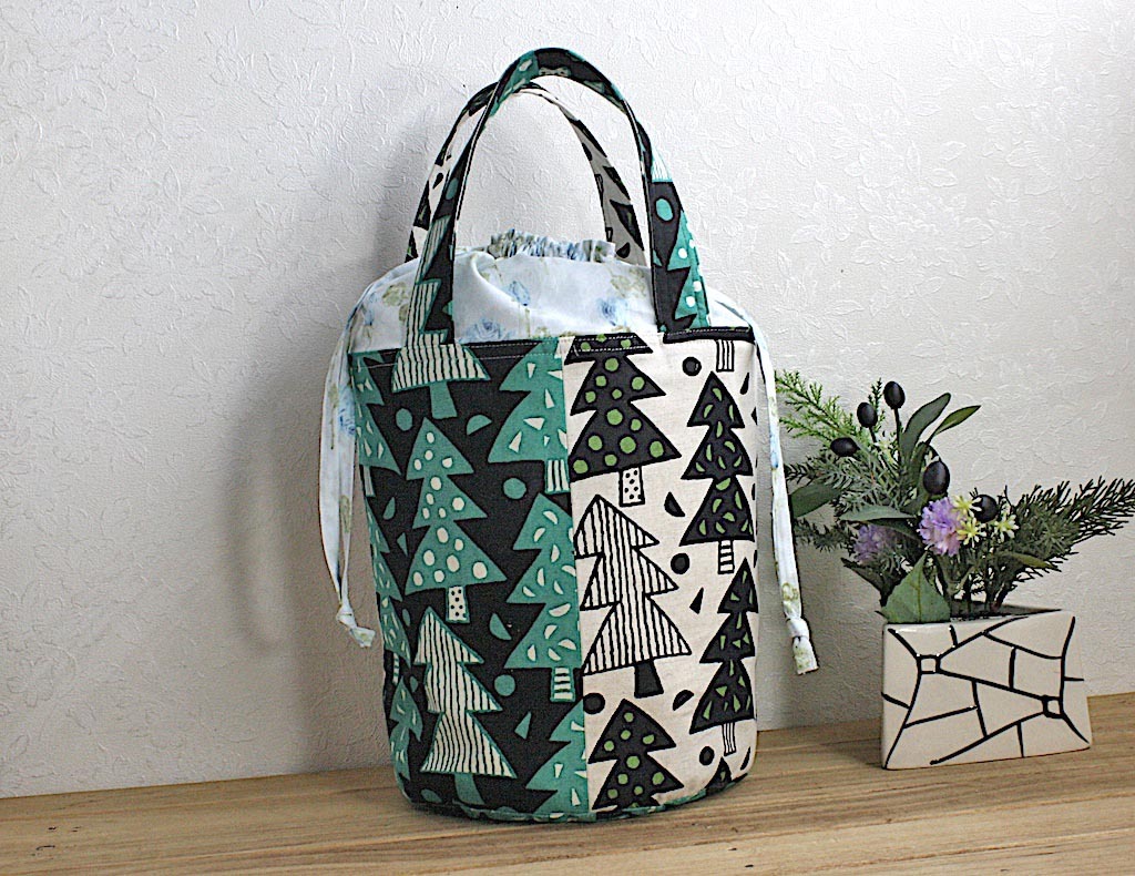 ★巾着 丸底 バケツ型 トートバッグ「ツリー 木」※表布に厚手接着芯貼付