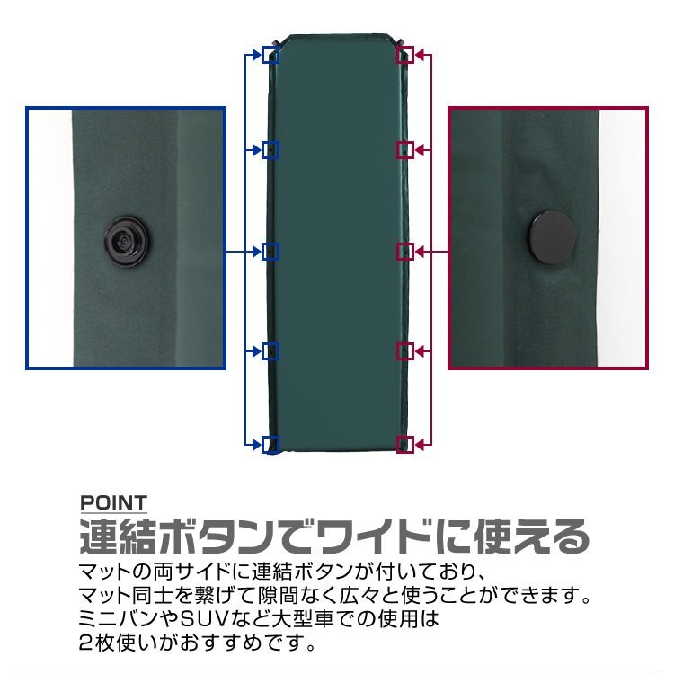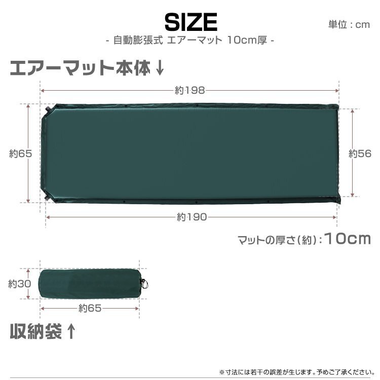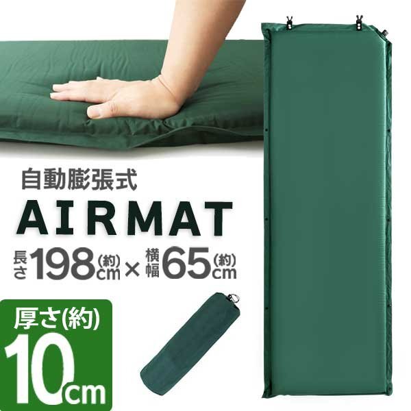 マット上部のバルブを開けば、それだけでマットが自動で膨らむので簡単に設置することができます。 厚さは10cmもあるため快適性は抜群で軽量です。 長時間寝ても疲れにくい高反発ウレタンだから快適に眠ることができます。 収納袋、収納バンドがついてくるから、簡単にコンパクトできます。 アウトドア・キャンプでの使用にはもちろん、ツーリング、車中宿泊などさまざまなシーンでご利用いただけます。 軽量・コンパクトなので地震や災害時の防災用品としてもオススメです。 【商品仕様】 内容:本体×1・収納袋×1 カラー:グリーン サイズ:(約)縦198cm×横65cm×厚さ10cm 収納サイズ(約):65cm×30cm 重量(約):3kg 【注意事項】 ※膨らみが足りない時は直接息を吹き込んで空気を入れてください。 ※膨らませすぎるとエアマットが破損する可能性がございますのでご注意ください。 |