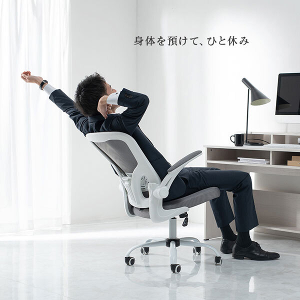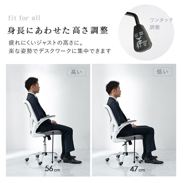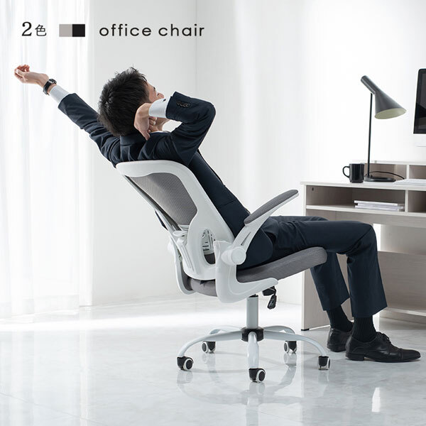 デスクチェア メッシュ張り肘付きオフィスチェアー グレー色 回転椅子 LHC-4471GYスタイリッシュなデザインの回転式アームチェアです。ガス圧でワンタッチ昇降。体重を掛けてレバーを操作すると座面が下がり、腰を浮かしながらレバーを操作すると座面が上がります。座面は大柄の人でも余裕のゆったり設計。長時間作業が快適な背もたれカーブで体圧を分散し、腰や肩の痛みを軽減してくれます。コンパクトな跳ね上げアームなので、デスクにすっきり収まり無駄なスペースは一切不要です。通気性抜群の爽やかなメッシュ張り。一年中蒸れずにサラサラの座り心地です。◇サイズ:幅63×奥行63×高さ100~109×座面高47~56センチ◇主材:スチール、ポリプロピレン◇張地:ポリエステル◇座面:ウレタンフォーム◇キャスター付◇ロッキング機能◇回転式◇ガス圧昇降式◇組立式☆落札、ご入金確認後 1~2日にて発送いたします 追加納期のかかるものは商品ページに記載いたしております よろしくお願いいたします。