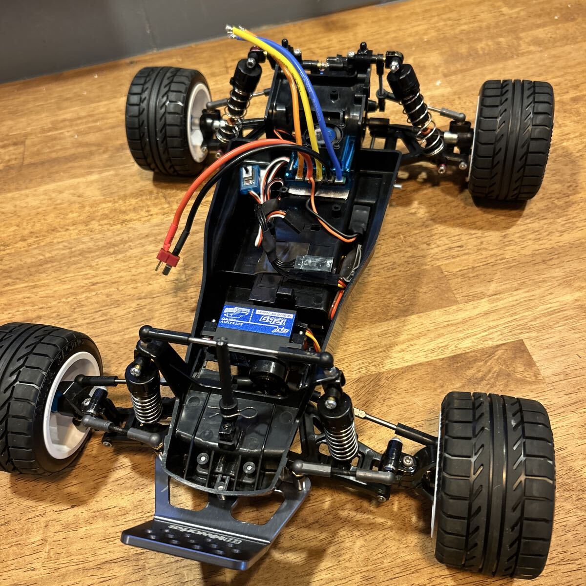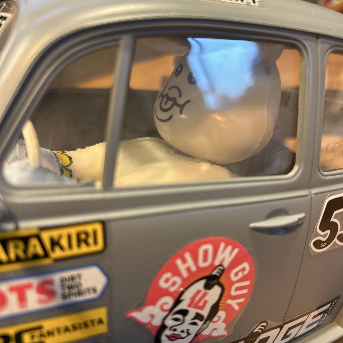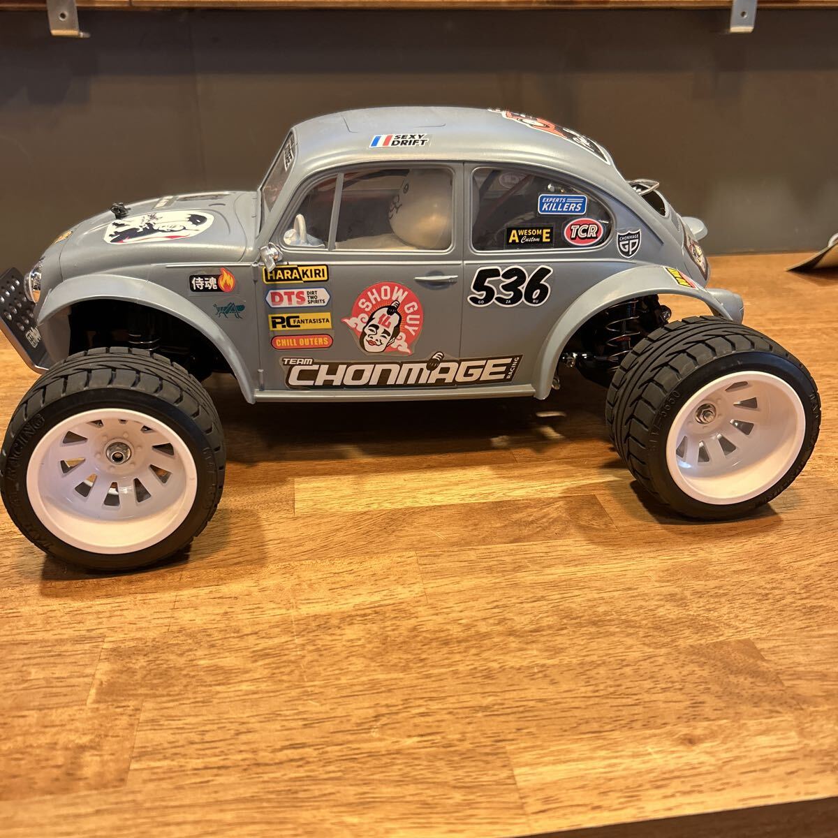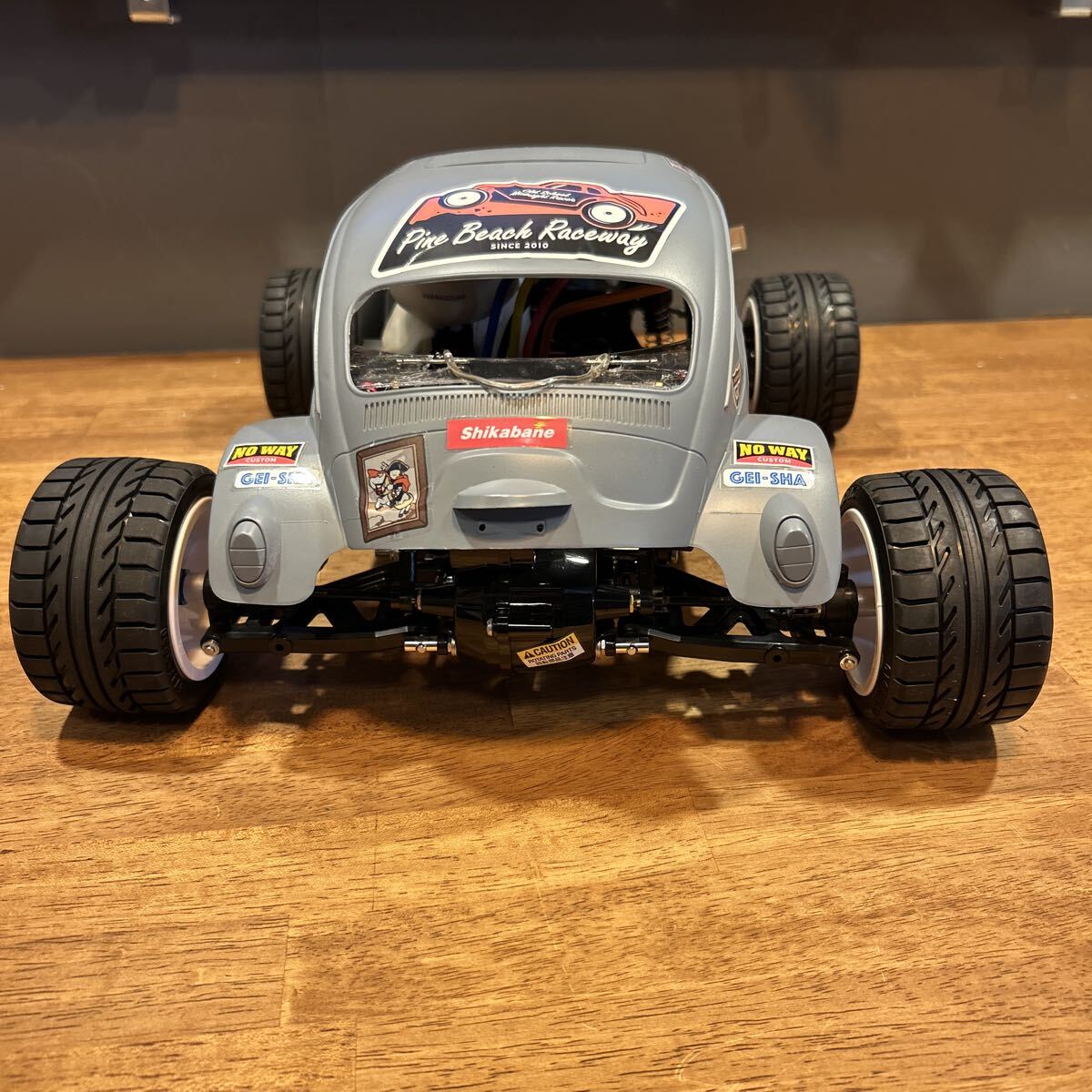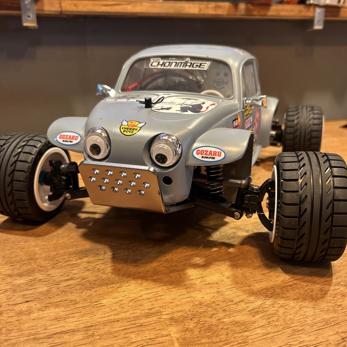 ワイドトレッド化、6角ハブ化、ターマックタイヤ、t4worksスキッドガード、など組み込んでいます。ステアサーボ、中華製アンプはお付けいたします。動作は未確認です。ボディはタミヤ製ビートル、ドライバーはクレーンゲームでゲットしたうぽちゃむでステアサーボとリンクして首が左右に動きます。
