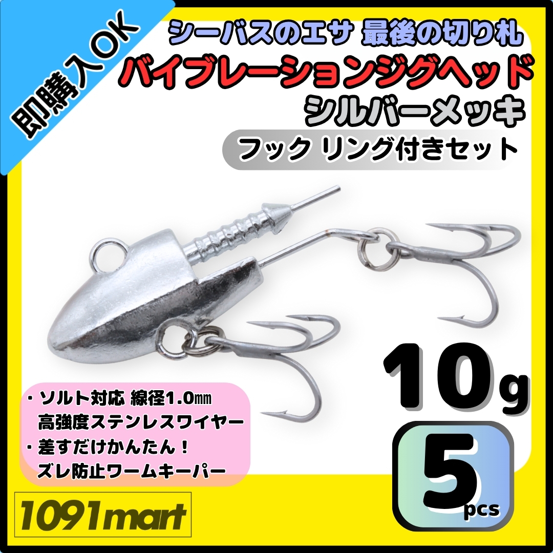 【送料無料】バイブレーションジグヘッド シルバーメッキ仕様 10g フック リング付き 5個セット VJ風 シーバスルアー ワーム