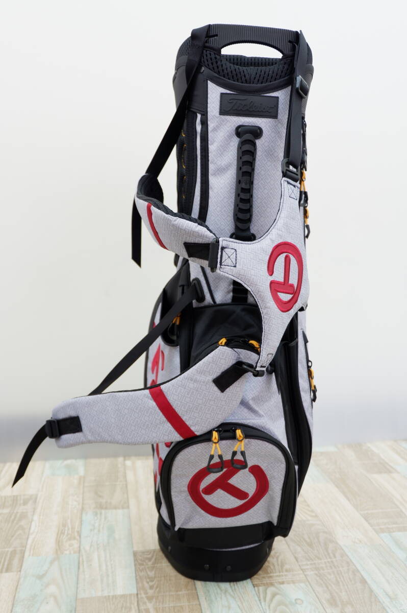 SC Geo デザインを採用したこの新しい Pathfinder スタンドバッグは、ダークレッドとイエローのアクセントが付いたグレーで、サークル T と 7 ポイント クラウンのアップリケが特徴です。また、便利なグローブ保持パッチ、新しい 7 ポイント クラウン機能を備えた丈夫なゴム製ハンドル、ナイロン製のウェブ ティー ホルダー、カスタム ジッパー プル、パッド入りの列、ペン ホルダー、広々としたポケット、お揃いのレイン フード、新しい Scotty Dog タオル ホルダーなど、必要なものがすべて揃っています。