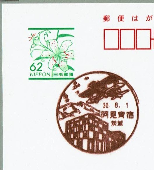 2018(平成30)年8月1日から使用開始された、風景印を官製はがきに使用開始の初日に押印。