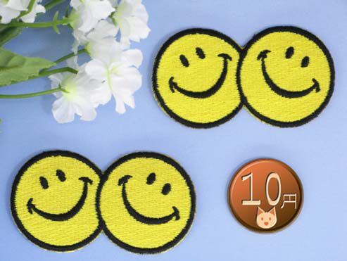 アイロンワッペン/刺繍/アップリケ/ダブルスマイルマーク黄色2枚セット/ニコニコ/ニコちゃんマーク