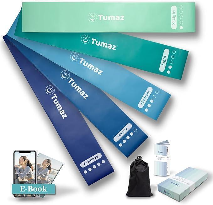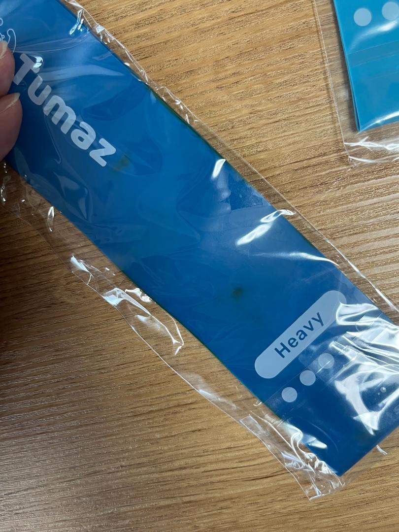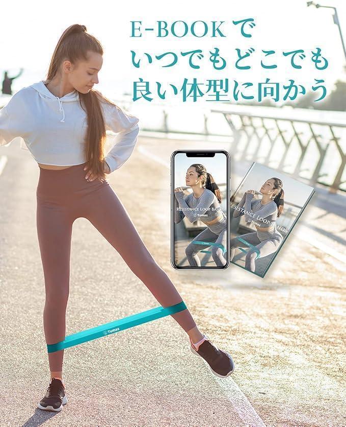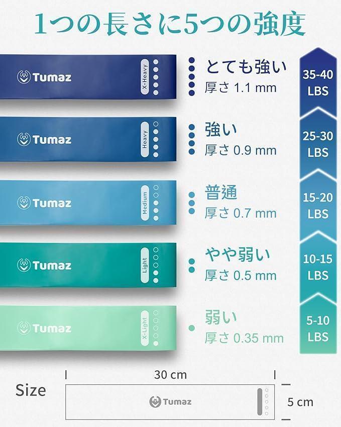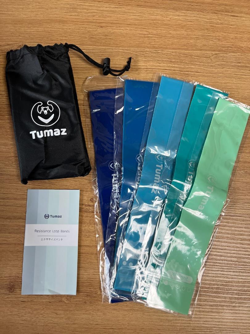 5本のエクササイズバンドが入っています。色別レベル: Green緑(弱い)、Yellow黄(やや弱い)、Orange橙(普通)、Blue青(強い)、Black黒(とても強い)。