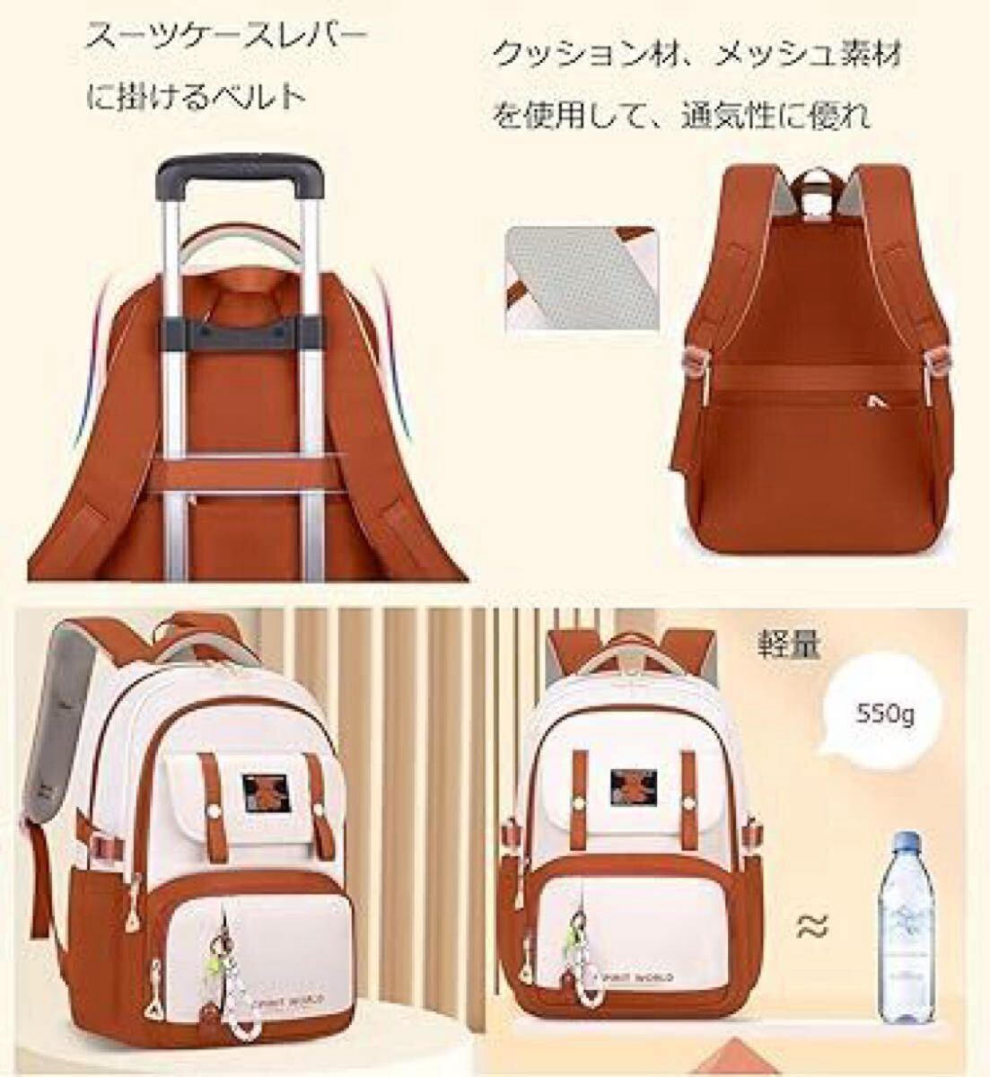 【サイズと便利】高さ45cm ×幅30cm ×厚さ18cm *背面はスーツケースレバーに掛ける用のベルトがあり、海外旅行、修学旅行などにとても便利です。ファスナーのスライダーの引手に紐がつき、握りやすく便利な作りになっています。