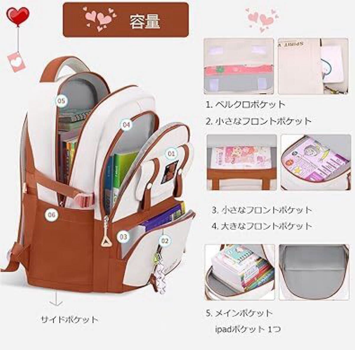 【大容量】メインポケット、1つのipadポケット、フロントポケットには携帯電話、証明書などが入れられ、サイド側のポケットの固定バックルは水ボトル、傘を固定できる。