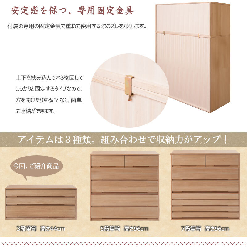 ■商品について/取っ手金物のないシンプルに仕上げたモダンな印象の桐箪笥。洋室などのフローリングにも合うデザインはリビングの中心にもはまる仕上がり。桐材は内部を一定の湿度に保とうとする働きがあるので大事な着物や洋服などを湿気から守る桐箪笥にしまうのがベスト。内部背板には竹炭シートを施しているので、消臭効果もプラス!クローゼットにもおさまるコンパクトサイズからラインナップし、着物や浴衣、洋服など長期保管に最適です。前板を2重に組み上げた箱組仕様で頑丈なつくりはもちろん、その構造だからできる繊細で優雅な取っ手デザイン。経年変化の風合いを楽しめる白木タイプ、ナチュラル・ブラウンの塗装仕上げタイプと3カラーをご用意。買い足し積み重ねて増える着物と洋服をしっかり収納。