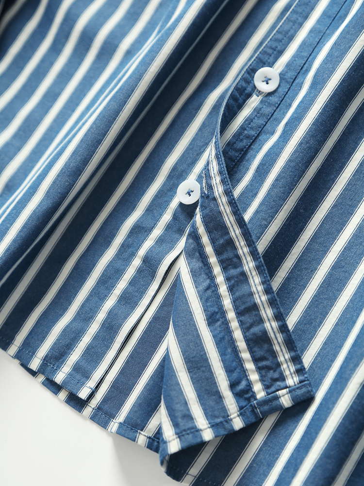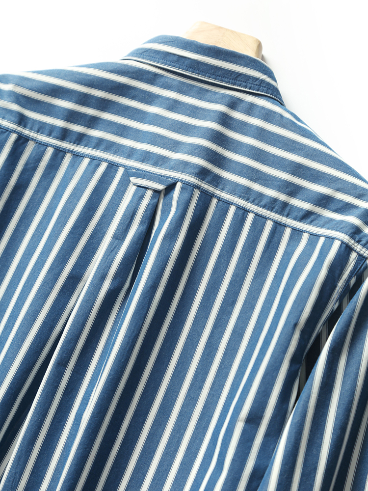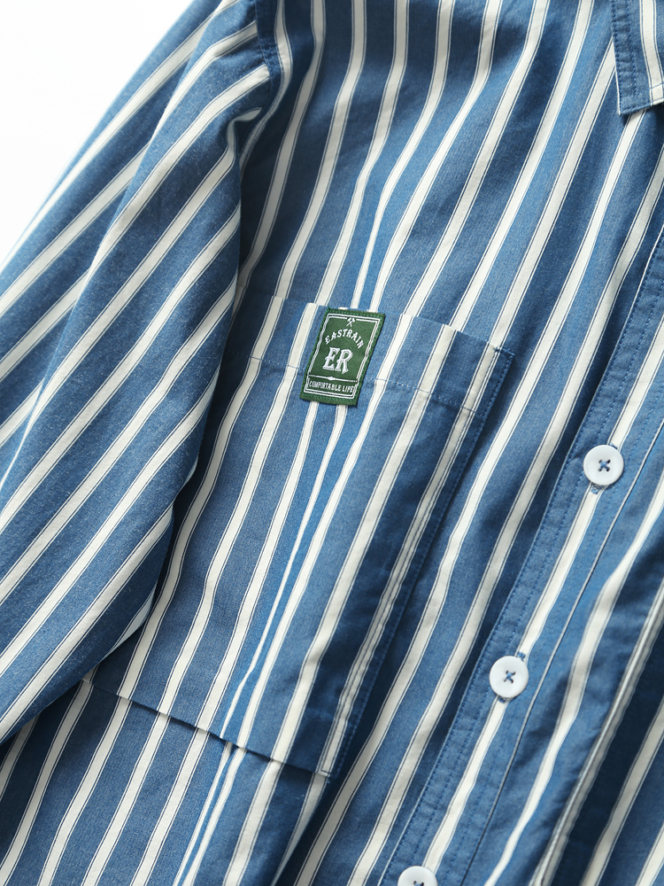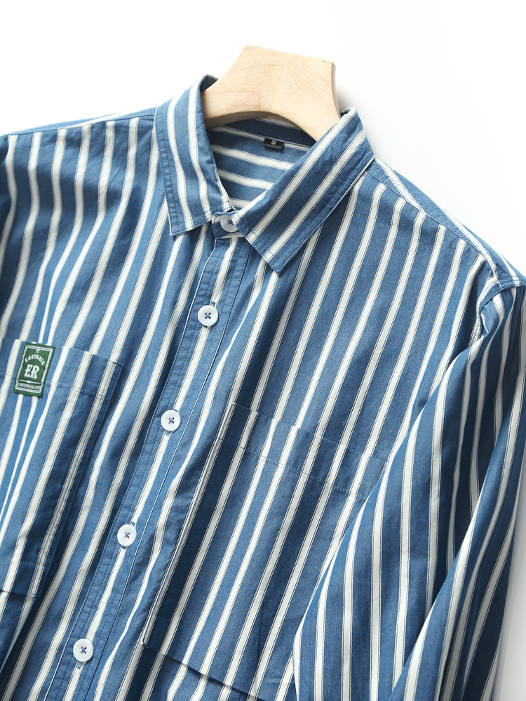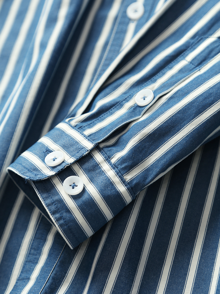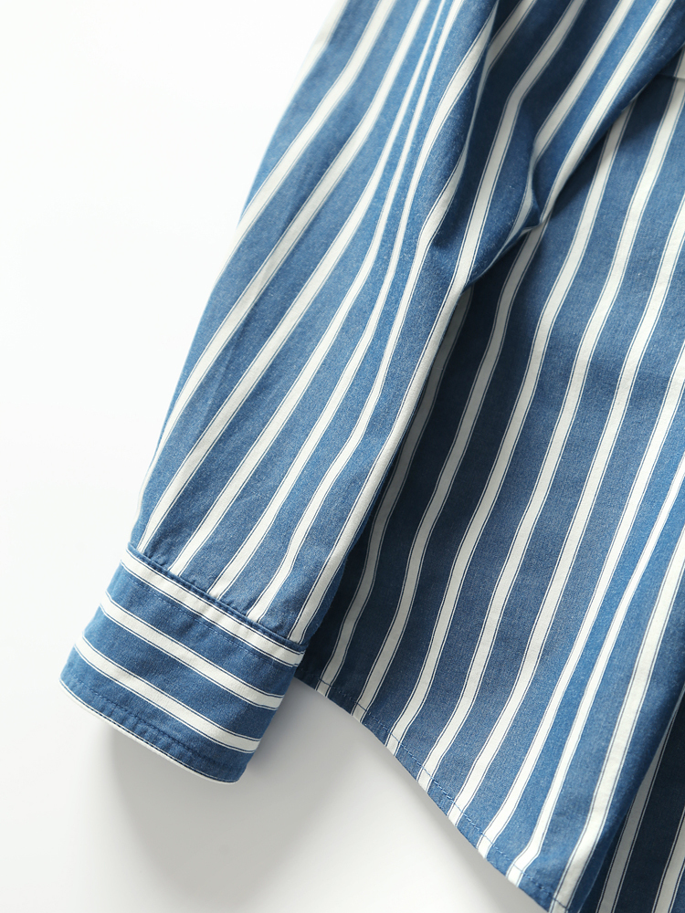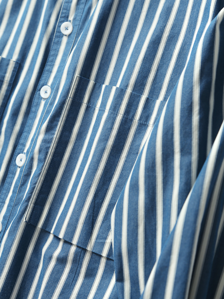 季節の変わり目にぴったりな、綿素材のストライプ長袖シャツ