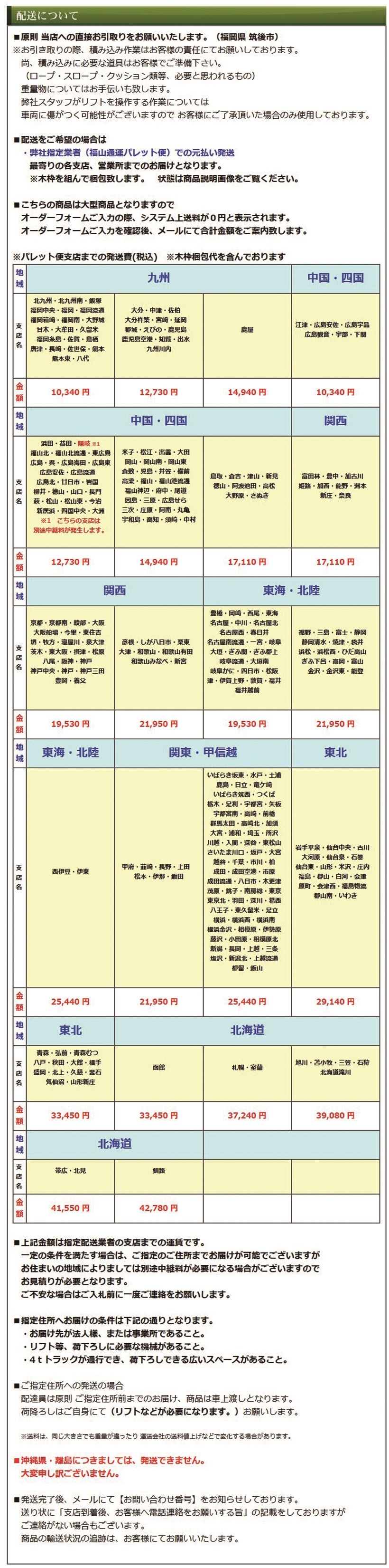 送料が0円と表記されている商品は原則直接引取りをお願いしております 商品の発送をご希望されるお客様につきましては システム上0円と表記されますが、 お届けには送料が発生致します。 配送方法は■福山通運 ■JPロジスティクス(旧TOLLエクスプレス) のいずれかのパレット便となります。 お届けは、ご自宅ではなく最寄りの支店留めとなります。 詳細は、「配送について」の欄へ記載しておりますので、必ずご確認頂き ご検討下さいますようお願い致します。 |