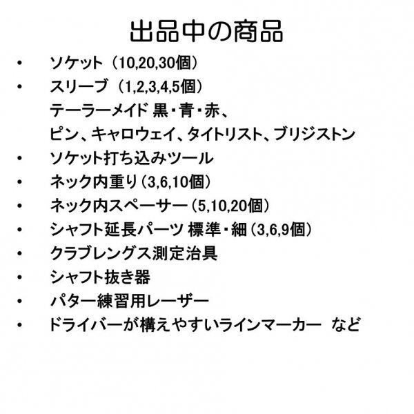 クラブレングス測定ツール、ソケット打ち込みツール、ソケット、各社スリーブ、スペーサー等のシャフト交換用パーツも出品しています。