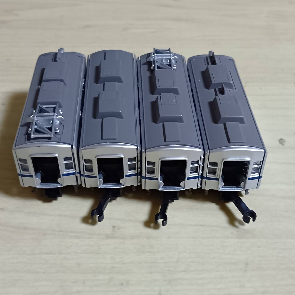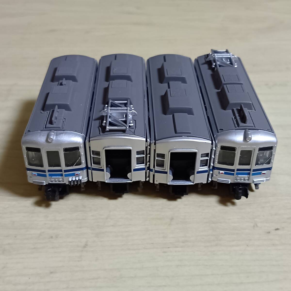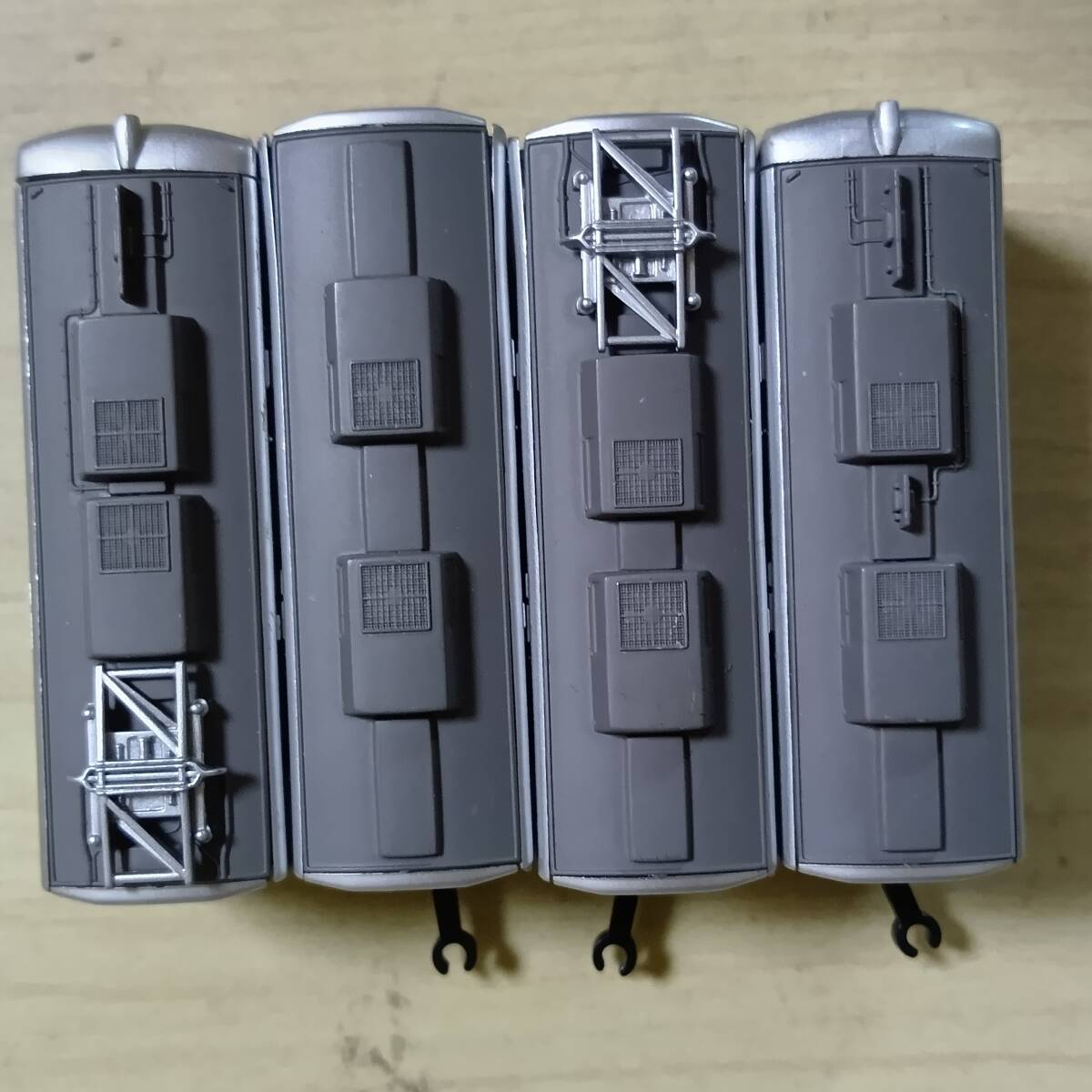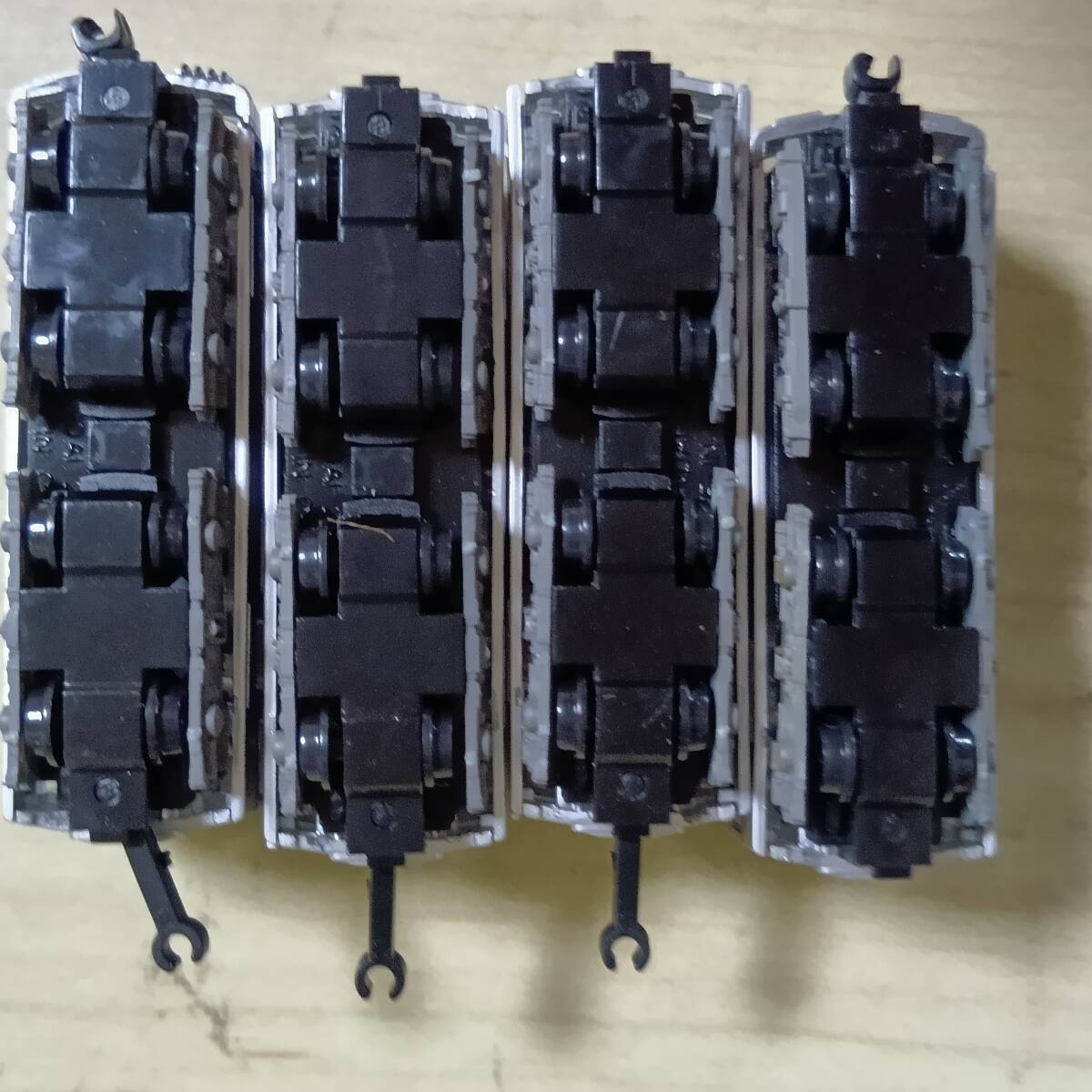 写真のもの送ります。きれいなものもあれば、塗装はげ、色付き、傷、欠品、壊れている(ボディー割れ、スカート割れ他)ものもあります。組間違いや他車部品(妻、レリーフ、パンタグラフ、スカート他)が使われている場合もあります。それらが、ついていない車両もあります。