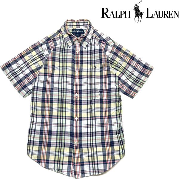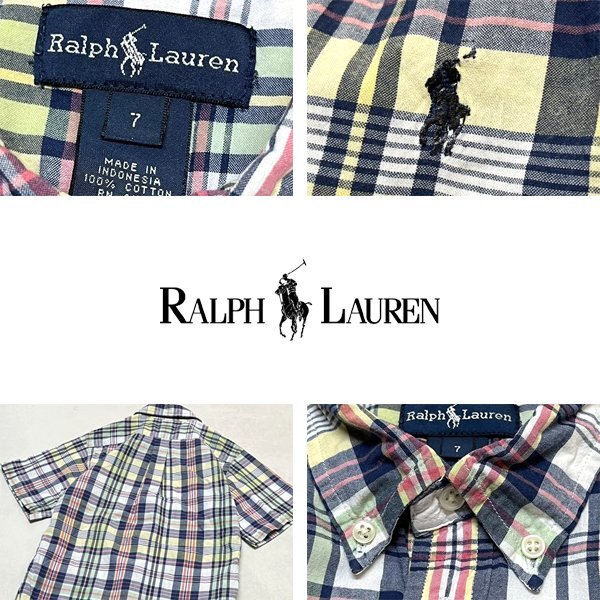 1点物◆ラルフローレン緑POLO半袖チェックシャツ古着キッズ7子供用アメカジ90sストリート/スポーツUSポニーブランドTシャツ130中古349469