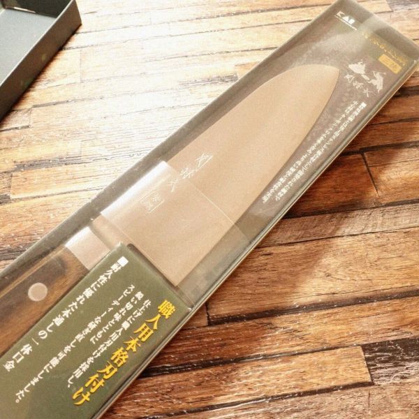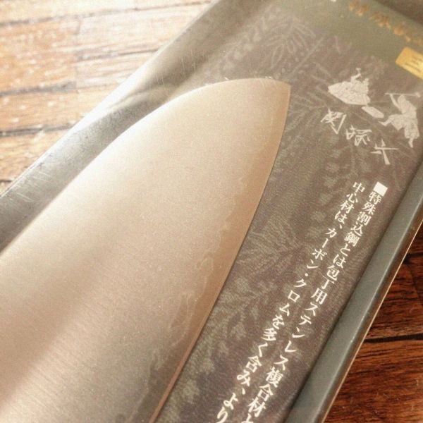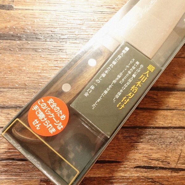 三徳包丁は、肉、魚、野菜のいずれにも対応できる万能包丁として広く使われています。未開封品ですので重さは箱を含めた重さです。シールを切らないと開封できない仕様ですので、中身が取り出せません。開封しておりませんので刃厚2-3mmと思いますが、目測です。多少のずれはご容赦ください。また保管品ですので箱への多少のダメージはご容赦ください。
