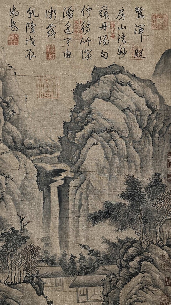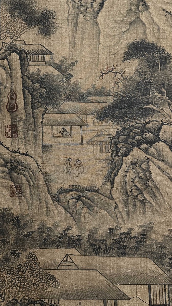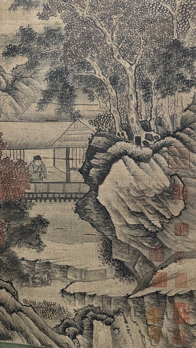 【瓏】「董源作 秋山秘語図」五代画家 肉筆絹本 掛け軸 書画立軸 巻き物 中国書画 古美術 蔵出