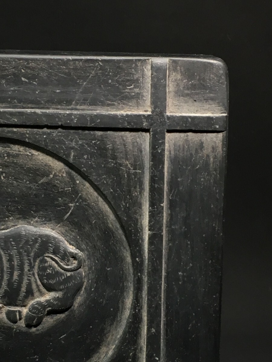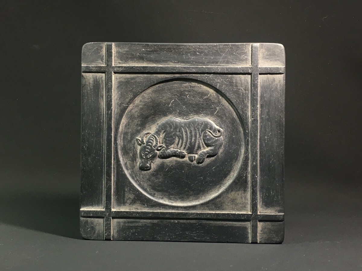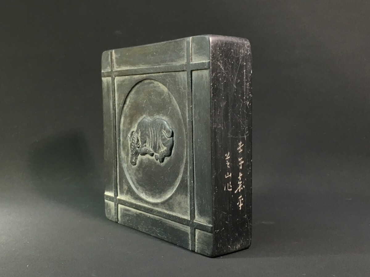 清代 老坑眉紋歙石彫 臥牛図文房歙硯 芝山作銘【仁】手彫り 文房具 書道具 中国古硯 蔵出 骨董