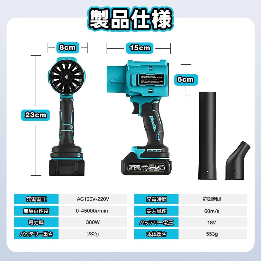 • 【マキタ互換バッテリー2個付き】ブロワーは1.3Ahのマキタ18V互換バッテリー2個を搭載し、連続使用が可能です。マキタ18V純正バッテリーと互換が可能です。また、充電中はLEDが赤色に点灯し、充電が完了するとLEDが緑色に点灯し、約3時間でフル充電できます。鋸作業の木くず、穴あけドリル作業の切粉、デジカメやキーボードのホコリを自動で手軽的に吹き飛ばします!