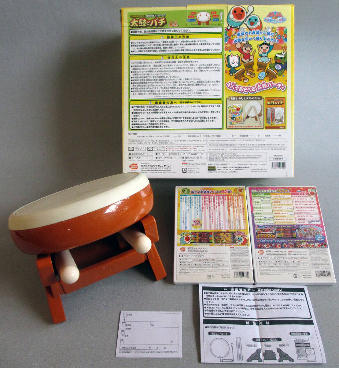 ・太鼓とバチ、台座、保証書(未記入)、取扱説明書x3、ケースx2、ジャケットx2、内箱x2、外箱