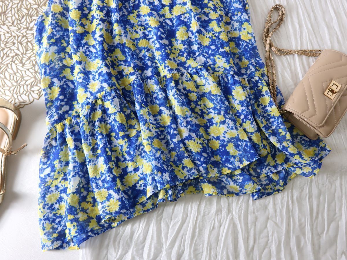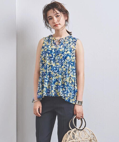 水彩画のような花柄が目を惹くノースリーブのブラウス。ティアードデザインとイレギュラーなヘムデザインが軽やかな動きを演出。襟元のリボンでネック周りのシルエットの変化も付けられます。上品な透け感も女性らしさをプラスする一着です。
