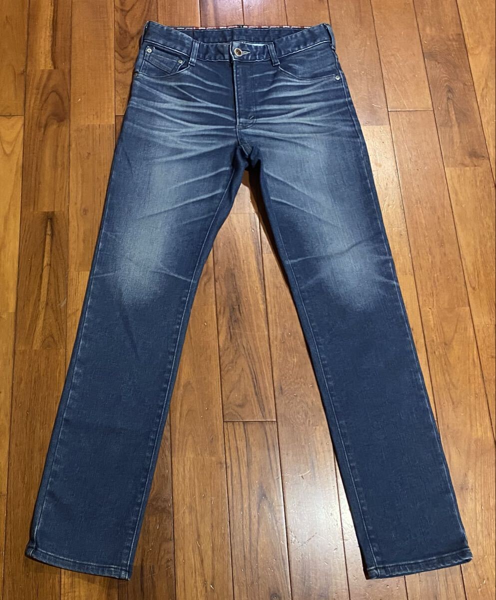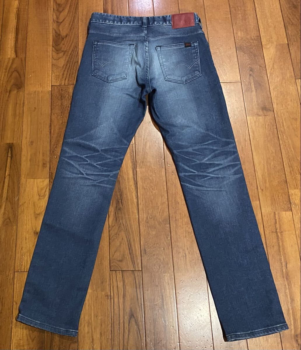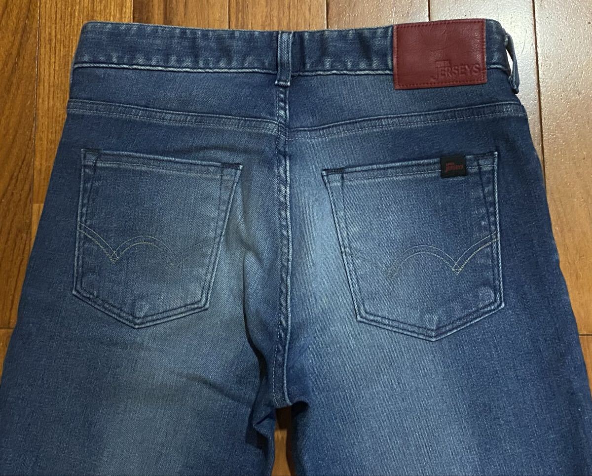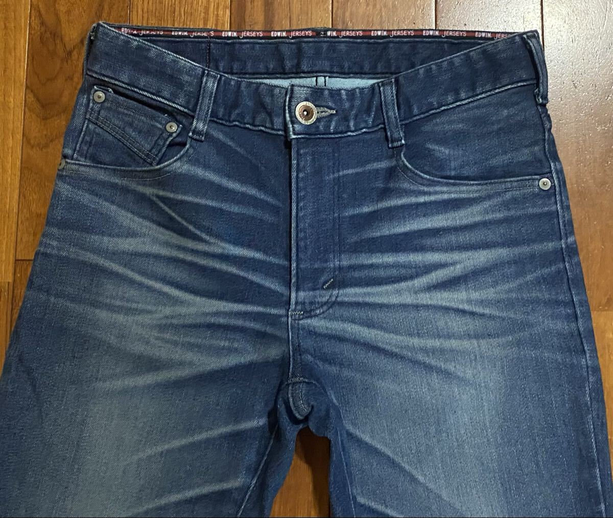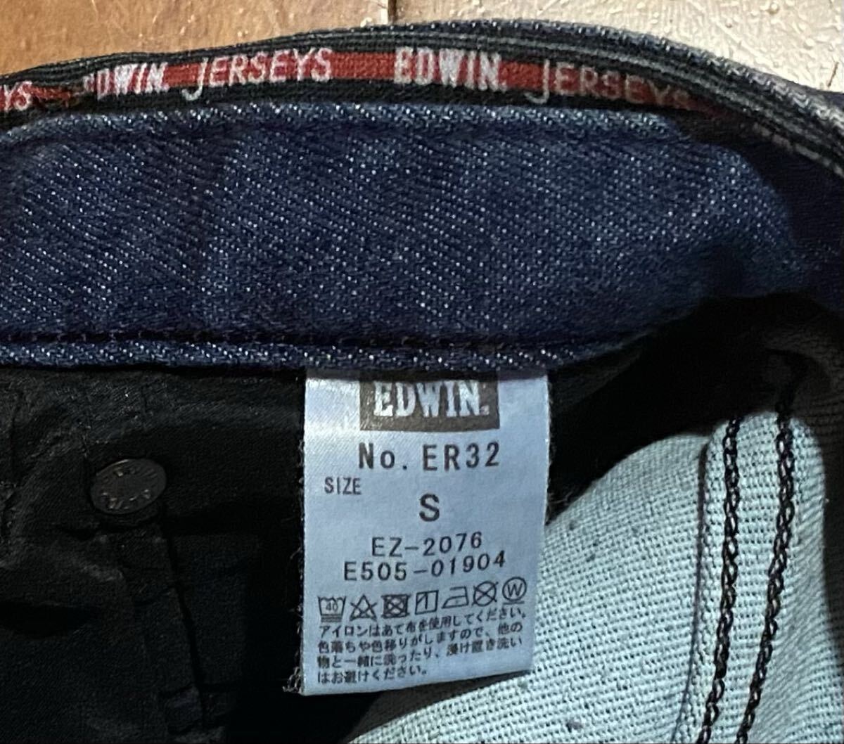 エドウィンのジャージーズ スリムテーパードデニムパンツ、No.ER32です。色はインディゴブルーです。USEDですが状態は良いです(10段階中8程度)。生地はストレッチ入りで綿77%、ポリエステル21%、ポリウレタン2%、ウエストリブはポリエステル95%、ポリウレタン5%です。ジッパーフライ、裾はチェーンステッチです。正規品です((株)エドウイン、日本製)。サイズはSでウエストは重ねずに平置きで約77cm、ヒップ約100cm、股上約26cm、股下約80cm、股下15cmのふともも部分約49cm、裾まわり約34cm、重量約540gです。発送はゆうパケットポストになります。