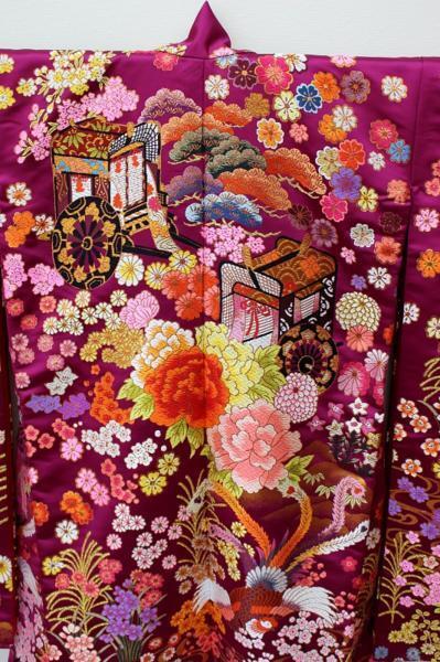 生地組織:緞子(どんす)織。素材:使用糸は全て正絹(シルク糸)に加え煌びやかな