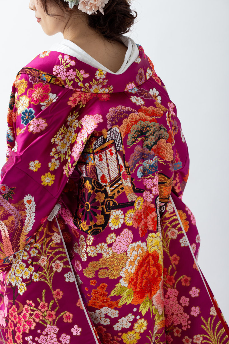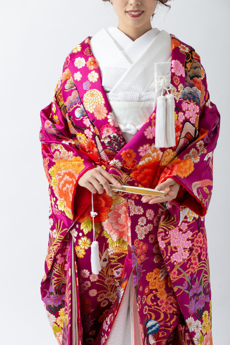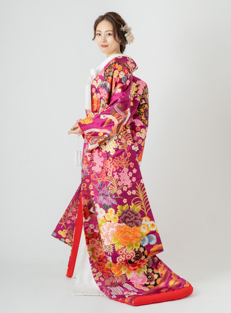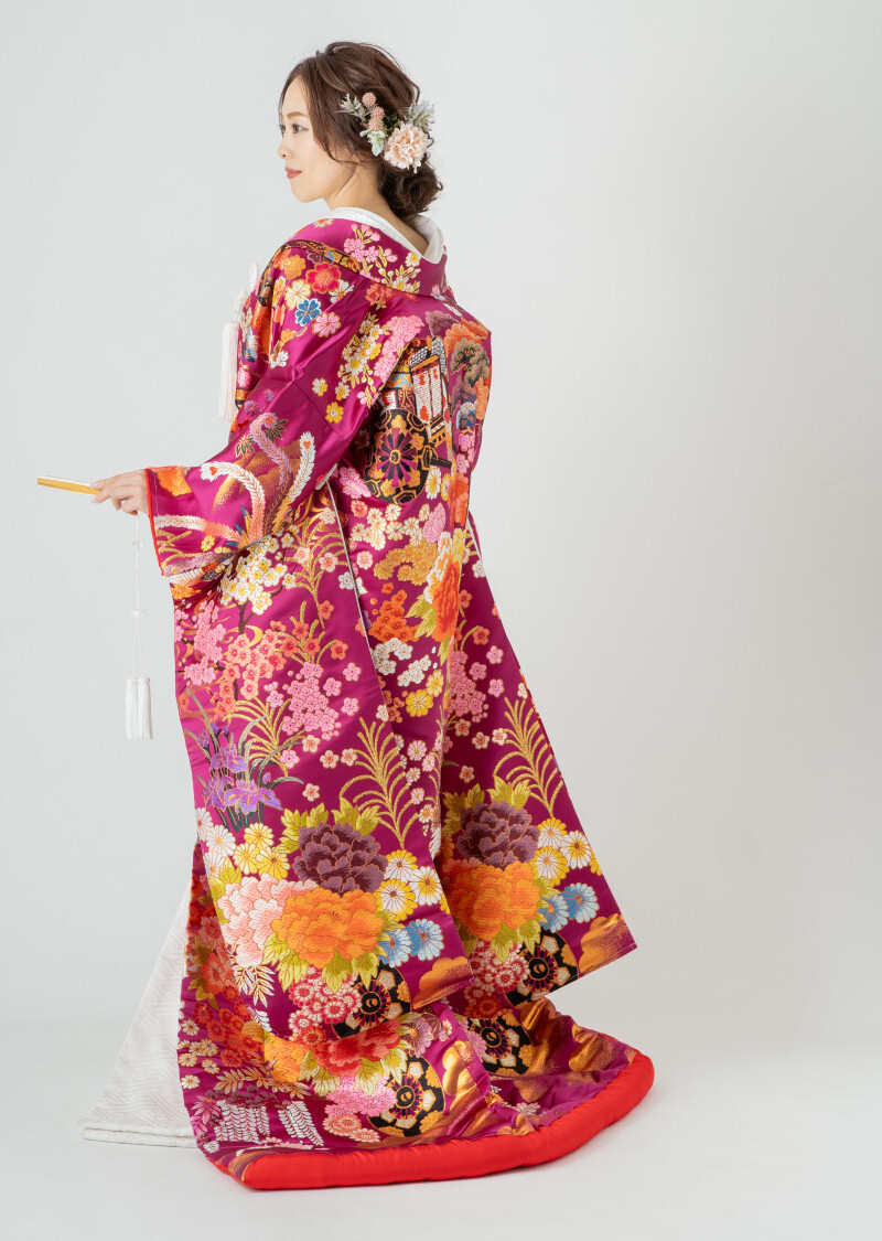 基本的に色打掛のサイズは1サイズです。ガウンのように羽織りますので着物のような体のサイズにあわせた