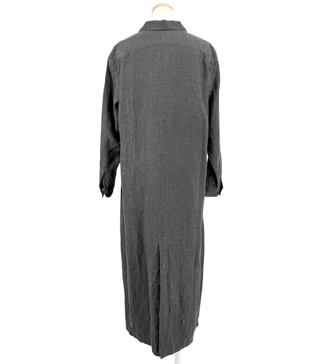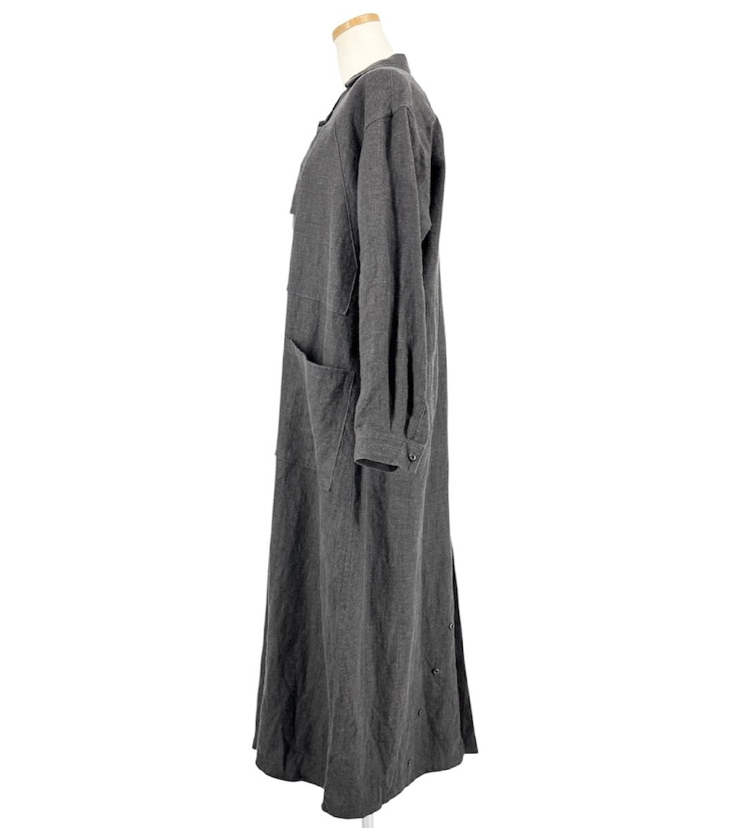 | コメント | ベルギーリネンを起毛させ、暖かみをもたせたシャツワンピースです。 ワンピースとしてはもちろん、ボトムスと合わせてショップコートとして、前を開けて羽織として、さらに後裾部分に配されたボタンを留めればオールインワンとしてもご着用頂ける、アレンジ自在な一着。 おもに秋冬向けの素材感ですが、春先までは着用できる程良い厚みで、夏以外の3シーズンに対応します。 |